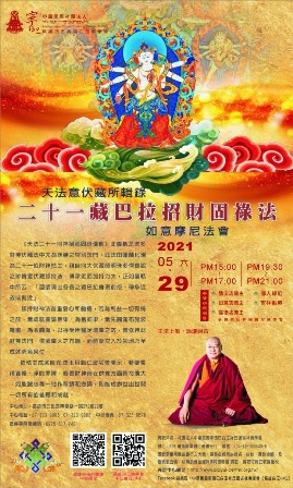 《天法二十一財神招福固祿儀軌》此儀軌是眾多財神伏藏法中尤為殊勝之特別法門,此法由蓮師化現為二十一位財神怙主,親自向大伏藏師明珠多傑宣說之珍貴意伏藏修持法。傳承近而加持力大,正如儀軌中所云:「蓮師現出各各之藏巴拉身現前授,傳承近故成就近」