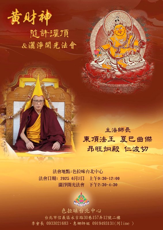 夏巴曲傑昂旺炯殿仁波切 黃財神隨許灌頂&灑淨開光法會 主法上師:夏巴曲傑 昂旺炯殿 仁波切 格魯 法會 2025/06/07 尊貴昂旺炯殿仁波切 黃財神隨許灌頂&灑淨開光法會 主法師長:東頂法王 夏巴曲傑 昂旺炯殿 仁波切 友善列印 上一篇:2025年 11月 德威仁波切 主法法會 下一篇:2025年10月放生法訊 精選法訊 2025八德佛堂7-12行事曆 2025/10/25~2025/12/29 寧瑪 共修 經續法林2025年度寶瓶修法 2025/10/25~2025/11/22 格魯 法會 開顯趨入甚深金剛瑜伽之道 2025/10/25~2025/11/29 格魯 課程 10月26日豐原財寶天王招財法會 2025/10/26 格魯 法會 2025 佐欽《聖綠度母祈福煙供法會》 2025/10/26 寧瑪 法會 10/26吉祥天母暨護法酬懺薈供除障法會 2025/10/26~2025/11/05 格魯 法會 『鄔金空行財神』無戲依一物增益祈福火供 2025/10/26 寧瑪 火供 南開寧波仁波切道場11月法訊 2025/10/28~2025/11/30 寧瑪 法會 喇嘛網| Facebook 全球慈悲智慧數位佛學院 全球藏傳佛教最新弘法訊息﹝ Google全球第一資訊同步 ﹞
