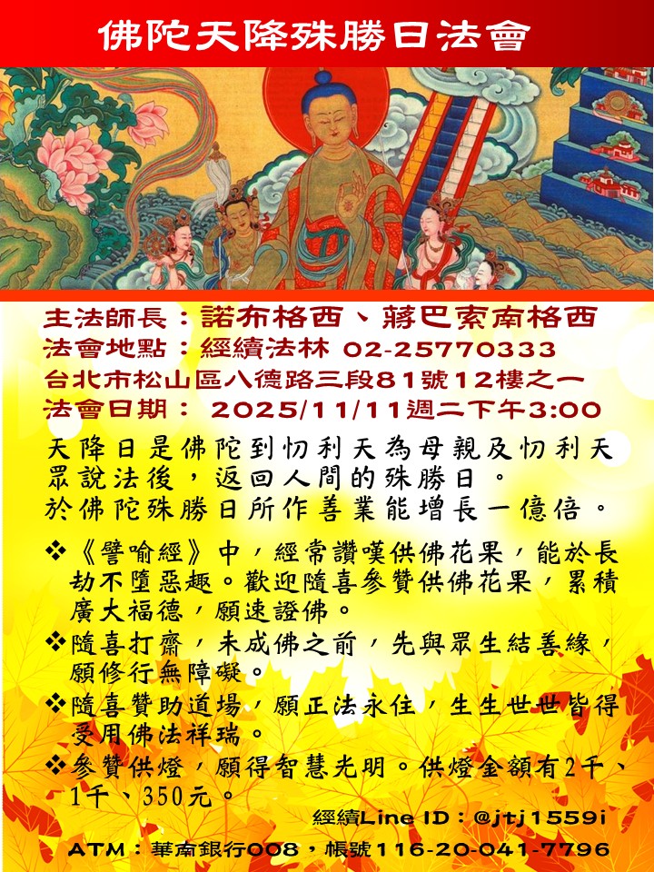 佛陀天降殊勝日法會 主法上師:諾布格西、蔣巴索南格西 格魯 法會 2025/11/11 諾布格西 佛陀天降殊勝日法會 主法師長:諾布格西、蔣巴索南格西 法會日期:2025/11/11週二下午3:00 法會地點:經續法林 電話:02-25770333 台北市松山區八德路三段81號12楼之一 友善列印 上一篇:經續法林 四百供法會 下一篇:佛降日殊勝共修法訊 精選法訊 金剛薩埵&蓮師薈供 2025/11/09~2025/11/10 寧瑪 法會 天降日報恩培福大法會 2025/11/10~2025/11/11 寧瑪 法會 殊勝日南印~密集金剛灑淨開光安座大法會 2025/11/10~2025/11/30 格魯 法會 2025佐欽大圓滿【佛陀天降月】法會 2025/11/11 寧瑪 法會 陀天降日 祈福誦經法會 2025/11/11 格魯 法會 梁皇寶懺法會.供佛齋天.瑜伽焰口 2025/11/11~2025/11/15 顯教 法會 11/11佛陀天降日~上師薈供誦經暨供燈 2025/11/11~2025/11/30 格魯 法會 天降日追憶佛陀.祈請正法永駐.報答母恩 2025/11/11 寧瑪 法會 喇嘛網| Facebook 全球慈悲智慧數位佛學院 全球藏傳佛教最新弘法訊息﹝ Google全球第一資訊同步 ﹞