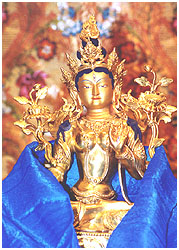 一頭表通達法性。二臂左表智慧,右表福報身。白色表自性清淨無垢,不為煩惱、所知二障所蔽蓋。頭戴五佛冠表轉五毒成五智。髮黑色表不染著。三分之二表自受用,三分之一表布施(他受用)。分兩綹披於雙肩表荷擔如來福慧兩種事業,令眾生成就色法二身。右手伸結與願印表滿一切眾生願。左手無畏印表以三寶加持六道。掌豎表功德,向外表慈悲。伸三指表佛、法、僧三寶。無名指表無明,拇指表智慧。相拈如環表無明為智慧所壓治而斷輪迴。拈鄔婆羅華藍色表大智慧。額間一目為中脈開口處,表大智慧由無漏通所得之眼通。面上二目為「地上輪」照天道、阿修羅道。手中二目表為「地面輪」照人道、畜生道。足心二目表「地下輪」照餓鬼道、地獄道。五色天衣表五方佛。天衣無縫表本體。五色表五佛智。天衣表根本智。綢裙五色表後得智。裙表掩蔽一切煩惱根。耳璫等六飾物表六度。頸瓔珞表不動佛,由禪定成就而有。胸瓔珞表寶生佛,由布施成就而有。臍瓔珞表不空成就佛,由精進成就而有。全身花鬘莊嚴表萬行;花表智慧,鬘表相續。細腰表離貪。二八妙齡表日新其德,永恆清淨之意。金剛跏趺表不住生死。手印表不住涅槃。坐於蓮花上之月輪表自受用之慈悲。背幔月輪墊表他受用之慈悲。