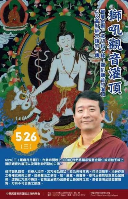 5/26(三)薩嘎月月圆日,台北時間晚上20:30 我们將請求智慧金剛仁波切给予線上狮吼觀音的灌頂以及黄財神咒語的口傳。