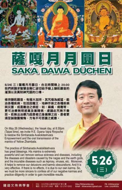On May 26 (Wednesday), the Vesak day, at 8:30pm (Taipei time), we invite H.E. Gyana Vajra Rinpoche to bestow the Simhanada Avalokiteshvara Empowerment and the oral transmission of the mantra of Yellow Zhambala.