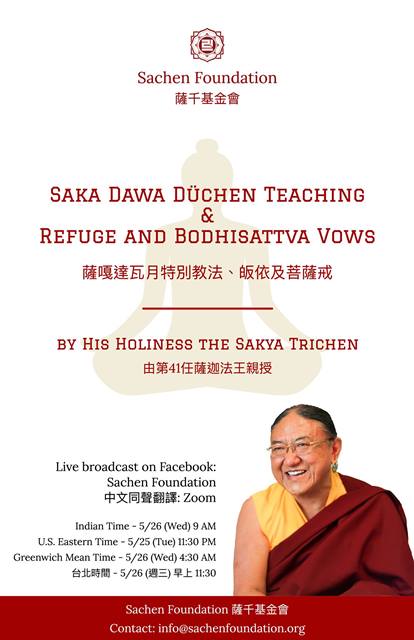 Sachen Foundation is delighted to announce that His Holiness the 41st Sakya Gongma Trichen Rinpoche will compassionately bestow the vows of Refuge and Bodhicitta on the morning of Saka Dawa Düchen. Join us and friends across the world, here on Facebook, to celebrate this holy day!
