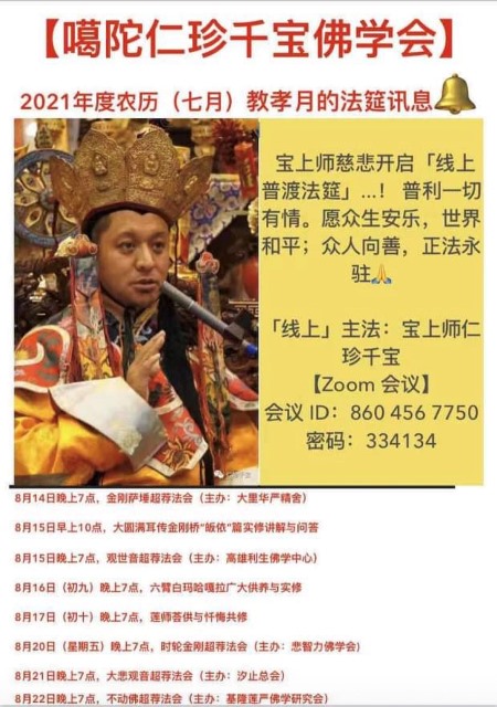 雖然疫情稍歇,各分會仍未啟封,但為利冥陽眾生,寶上師仁珍千寶慈悲,啟開「線上普渡法筵」...!