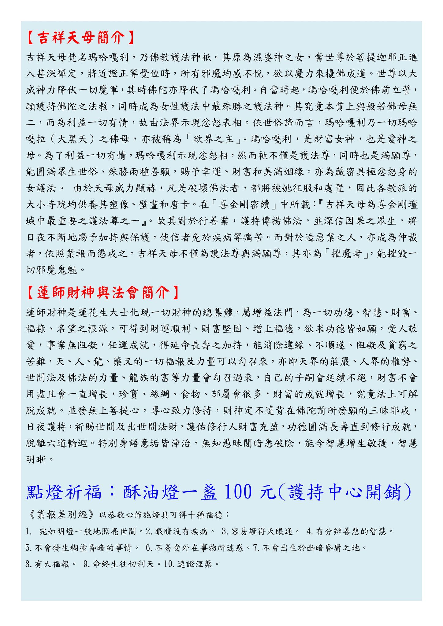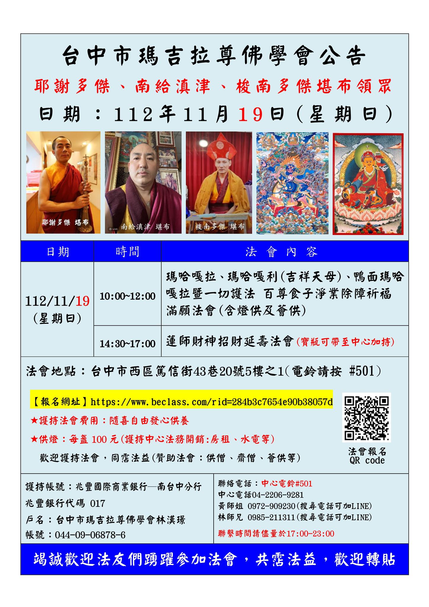 112/11/19吉祥天母100多瑪除障 主法上師:耶謝多傑、南給滇津、梭南多傑堪布 噶舉 法會 2023/11/11~2023/11/19 我要參加 我要祈福 尊貴赤令貝久仁波切 台中市瑪吉拉尊佛學會法訊公告 【報名網址】https://www.beclass.com/rid=284b3c7654e90b38057d 【領眾法師】尊貴的 耶謝多傑、南給滇津、梭南多傑堪布 【法會內容】 ★上午 10:00-12:00 瑪哈嘎拉、瑪哈嘎利(吉祥天母)、鴨面瑪哈嘎拉暨一切護法 百尊食子淨業除障祈福滿願法會(含燈供及薈供) ★下午 14:30-17:00 蓮師財神招財延壽祈福法會(寶瓶可帶至中心加持) 【法會日期】112/11/19(日) 【法會時間】上午10:00-12:00 & 下午14:30-17:00 【法會地點】台中市西區篤信街43巷20號5樓之1(電鈴#501) 【備註】★詳情請詳閱法訊 ★歡迎法友轉貼法訊分享 【護持帳號】 兆豐國際商業銀行─南台中分行 兆豐銀行代碼 017 戶名:台中市瑪吉拉尊佛學會林漢璟 帳號:044-09-06878-6 【聯絡電話】 中心電鈴 按 #501 中心電話04-2206-9281 黃師姐 0972-909230(搜尋電話可加LINE) 林師兄 0985-211311(搜尋電話可加LINE) 聯繫時間請儘量於17:00-23:00 友善列印 上一篇:卡拉非常需要你的愛 下一篇:歲末瑪哈嘎啦除障祈福法會 台中市瑪吉拉尊佛學會 偉大的不丹竹巴噶舉傳承 ~ 成就者之王 夏迦師利傳承 - 二位真正實修 , 都曾代表不丹國師的 LAM 仁波切 密勒日巴尊者夢授破瓦法 . 施身法 . 及各類甚深教法,口傳傳授 每月不定期舉辦灌頂 . 除障 . 薈供 . 超渡 . 火供..等法會 施身法共修 聯絡電話: :0972-909230 地址 : 台中市西區篤信街43巷20號5樓之1 精選法訊 象鼻財神·忿怒蓮師馬鵬熾燃歲末除障法會 2025/12/13~2025/12/14 寧瑪 法會 《入行論第五品護正知》教授 2025/12/13~2026/02/28 格魯 課程 臺灣格魯總會2025燃燈節暨上師薈供 2025/12/14 格魯 法會 『金剛薩埵』無戲依一物息災袪病延壽火供 2025/12/14 寧瑪 火供 台灣廣覺林佛學中心 燃燈節祈福法會 2025/12/14 格魯 法會 燃燈節宗大師成道紀念日上師薈供法會 2025/12/14 格魯 法會 台北市大乘林佛學會燃燈節 大宗喀巴千供 2025/12/14 格魯 法會 1214《降澍加持雨》 2025/12/14 噶舉 法會 喇嘛網| Facebook 全球慈悲智慧數位佛學院 全球藏傳佛教最新弘法訊息﹝ Google全球第一資訊同步 ﹞