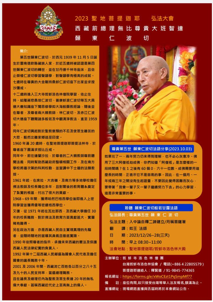 2023聖地菩提迦耶弘法大會現場報名連結 主法上師:尊貴 桑東仁波切 格魯 法會 2023/12/26~2023/12/28 我要參加 我要祈福 尊貴 顙東仁波切 2023聖地菩提迦耶弘法大會-現場報名網路連結:https://forms.gle/oJiH2n7SMVqLmX9UA 相關資訊 Email:loselingtw@yahoo.com.tw 友善列印 上一篇:113年 年度光明燈 預約登記 下一篇:農禪寺彌陀佛五暨八關戒齋 精選法訊 象鼻財神·忿怒蓮師馬鵬熾燃歲末除障法會 2025/12/13~2025/12/14 寧瑪 法會 《入行論第五品護正知》教授 2025/12/13~2026/02/28 格魯 課程 臺灣格魯總會2025燃燈節暨上師薈供 2025/12/14 格魯 法會 『金剛薩埵』無戲依一物息災袪病延壽火供 2025/12/14 寧瑪 火供 台灣廣覺林佛學中心 燃燈節祈福法會 2025/12/14 格魯 法會 燃燈節宗大師成道紀念日上師薈供法會 2025/12/14 格魯 法會 台北市大乘林佛學會燃燈節 大宗喀巴千供 2025/12/14 格魯 法會 1214《降澍加持雨》 2025/12/14 噶舉 法會 喇嘛網| Facebook 全球慈悲智慧數位佛學院 全球藏傳佛教最新弘法訊息﹝ Google全球第一資訊同步 ﹞