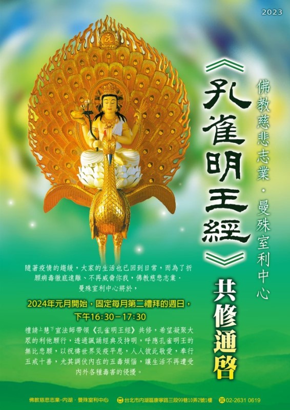 曼殊室利中心《孔雀明王經》共修 主法上師:禮請上慧下宣法師帶領 顯教 修行 2024/01/01~2024/02/28 曼殊室利中心 《孔雀明王經》共修通啟 隨著疫情的趨緩,大家的生活也已回到日常,而為了希望病毒徹底遠離、不再威脅你我,佛教慈悲志業.曼殊室利中心,將於2024年元月開始,固定每月第二禮拜的週日,下午16:30〜17;30,禮請上慧下宣法師帶領《孔雀明王經》共修,祈願凝聚大眾的慈心善行,透過諷誦經典及持明,呼應孔雀明王的無比悲願,以祝禱世界災疫平息,人人彼此敬愛,奉行五戒十善,尤其調伏內在的五毒煩惱,讓生活不再遭受內外各種毒害的侵擾。 法會活動歡迎自由參加,不須報名。 友善列印 上一篇:中華慈悲僧伽會1月法訊 免費線上牌位 下一篇:2024尼泊爾大塔院佛光普照佛前供燈活動 精選法訊 梵唄與修行(定課篇) 課程 2025/12/16~2026/01/13 顯教 課程 耶喜然杰喇嘛-施身法實修閉關 2025/12/16~2025/12/20 噶舉 閉關 《安樂道論》教授&白度母長壽灌頂 2025/12/19~2025/12/21 格魯 灌頂 2025催破金剛灌頂 2025/12/20 薩迦 灌頂 孔雀明王寺 24小時經聲不斷法會 2025/12/20~2025/12/27 顯教 法會 康薩仁波切2025年12月弘法行程 2025/12/20~2025/12/25 格魯 灌頂 黑怒母金剛藏&三身空行淨障日修&勾壽事業 2025/12/20 寧瑪 法會 蓮師 鄔金空行財神無戲依一物增益祈福火供 2025/12/21 寧瑪 火供 喇嘛網| Facebook 全球慈悲智慧數位佛學院 全球藏傳佛教最新弘法訊息﹝ Google全球第一資訊同步 ﹞