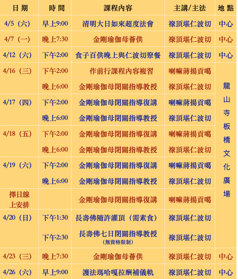 祿頂堪仁波切 台灣弘法行程 主法上師:尊貴 祿頂堪仁波切 薩迦 法會 2025/03/10~2025/04/26 尊貴祿頂堪仁波切 大恩上師 祿頂堪仁波切 台灣弘法行程 中華密宗耶旺傑仟佛學會主辦 表單截止日期4月3日。 報名連結https://docs.google.com/forms/d/e/1FAIpQLSc1fk0BRwWCTGkxBWAuvsX5baS8cwSkxC8KQ4YMsMs4rShZrg/viewform?usp=header 相關資訊 友善列印 上一篇:龍達斯列大長老台灣弘法行程 下一篇:AI人工智能與BI佛法智慧 精選法訊 象鼻財神·忿怒蓮師馬鵬熾燃歲末除障法會 2025/12/13~2025/12/14 寧瑪 法會 《入行論第五品護正知》教授 2025/12/13~2026/02/28 格魯 課程 臺灣格魯總會2025燃燈節暨上師薈供 2025/12/14 格魯 法會 『金剛薩埵』無戲依一物息災袪病延壽火供 2025/12/14 寧瑪 火供 台灣廣覺林佛學中心 燃燈節祈福法會 2025/12/14 格魯 法會 燃燈節宗大師成道紀念日上師薈供法會 2025/12/14 格魯 法會 台北市大乘林佛學會燃燈節 大宗喀巴千供 2025/12/14 格魯 法會 1214《降澍加持雨》 2025/12/14 噶舉 法會 喇嘛網| Facebook 全球慈悲智慧數位佛學院 全球藏傳佛教最新弘法訊息﹝ Google全球第一資訊同步 ﹞