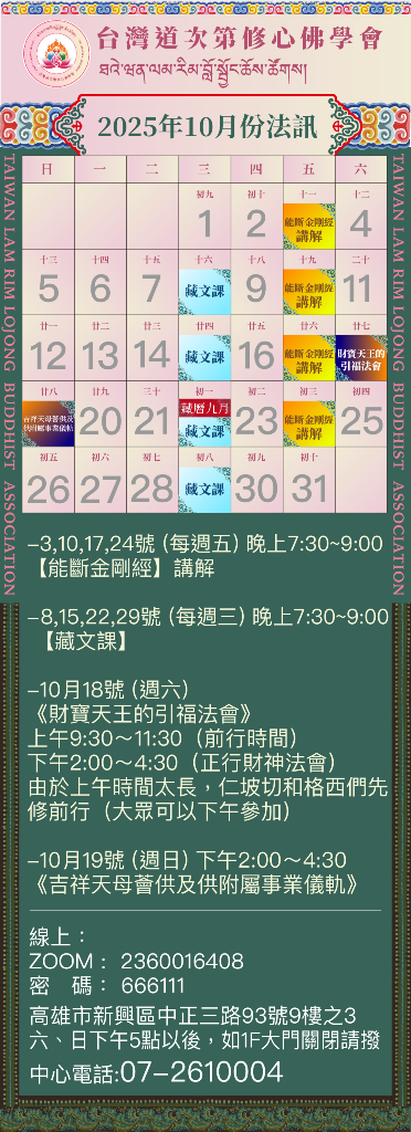 台灣道次第修心佛學會10月份法訊 格魯 法會 2025/10/04~2025/10/31 台灣道次第修心佛學會2025年10月份法訊 新興區中正三路93號9樓之3 六、日下午5點以後,如1F大門關閉 請撥中心電話:07-2610004 友善列印 上一篇:台灣聞思寶藏佛學會10月法訊 下一篇:元果佛學會10月法訊 精選法訊 台灣佛法顯密洲佛學會2025.10月法訊 2025/10/03~2025/10/31 寧瑪 課程 『大悲救苦自解脫』大灌頂及儀軌傳授 2025/10/03~2025/10/26 寧瑪 修行 台灣聞思寶藏佛學會10月法訊 2025/10/03~2025/10/31 格魯 法會 2025般若心經除障暨大威德金剛超度法會 2025/10/04~2025/10/05 格魯 法會 2025大白傘蓋佛母祈福/消災/迴遮法會 2025/10/04~2025/10/05 寧瑪 法會 台灣道次第修心佛學會10月份法訊 2025/10/04~2025/10/31 格魯 法會 元果佛學會10月法訊 2025/10/04~2025/10/25 格魯 法會 台中釋迦牟尼佛中心10月課程表 2025/10/05~2025/10/31 格魯 法會 喇嘛網| Facebook 全球慈悲智慧數位佛學院 全球藏傳佛教最新弘法訊息﹝ Google全球第一資訊同步 ﹞