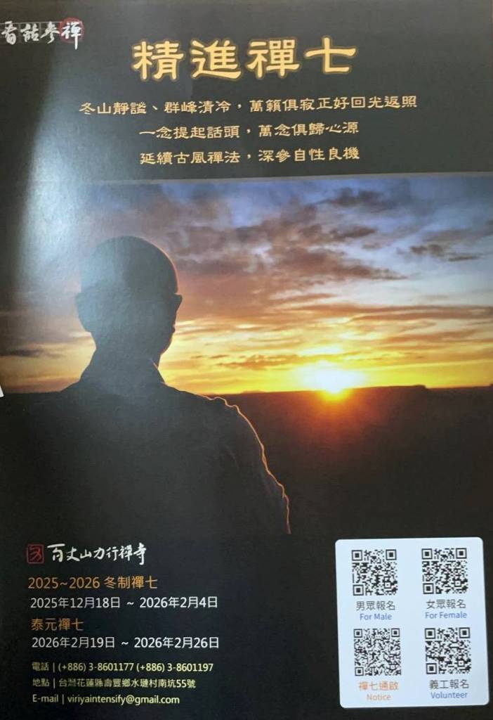 百丈山力行行禪寺 精進禪七 顯教 閉關 2025/10/07~2026/02/26 精進禪七 百丈山力行行禪寺 2025〜2026 冬制禪七 2025年12月18日〜2026年2月4日 泰元禪七 2026年2月19日〜2026年2月26日 電話:(+886)3-8601177 (+886)3-8601197 地點:台灣花蓮縣壽豐鄉水璉村南坑55號 E-mail:viriyaintensify@gmail.com 相關資訊 友善列印 上一篇:敦珠傳承 金剛薩埵灌頂生死兩利淨障大法會 精選法訊 台中釋迦牟尼佛中心10月課程表 2025/10/05~2025/10/31 格魯 法會 第12屆佛頂尊勝佛母千供法會 2025/10/07~2025/10/11 薩迦 法會 百丈山力行行禪寺 精進禪七 2025/10/07~2026/02/26 顯教 閉關 2025/10/08南印齋僧供養通啟 2025/10/08 格魯 法會 熹嘉仁波切2025台灣弘法行程(取消通知) 2025/10/08~2025/10/25 格魯 法會 經典導讀課《解深密經》第三季 2025/10/08~2025/12/24 噶舉 課程 梁皇寶懺法會.供佛齋天.瑜伽焰口-龍王金殿 2025/10/08~2025/10/12 顯教 法會 尊貴仰丁仁波切2025年台灣弘法行 2025/10/10~2025/10/19 格魯 課程 喇嘛網| Facebook 全球慈悲智慧數位佛學院 全球藏傳佛教最新弘法訊息﹝ Google全球第一資訊同步 ﹞