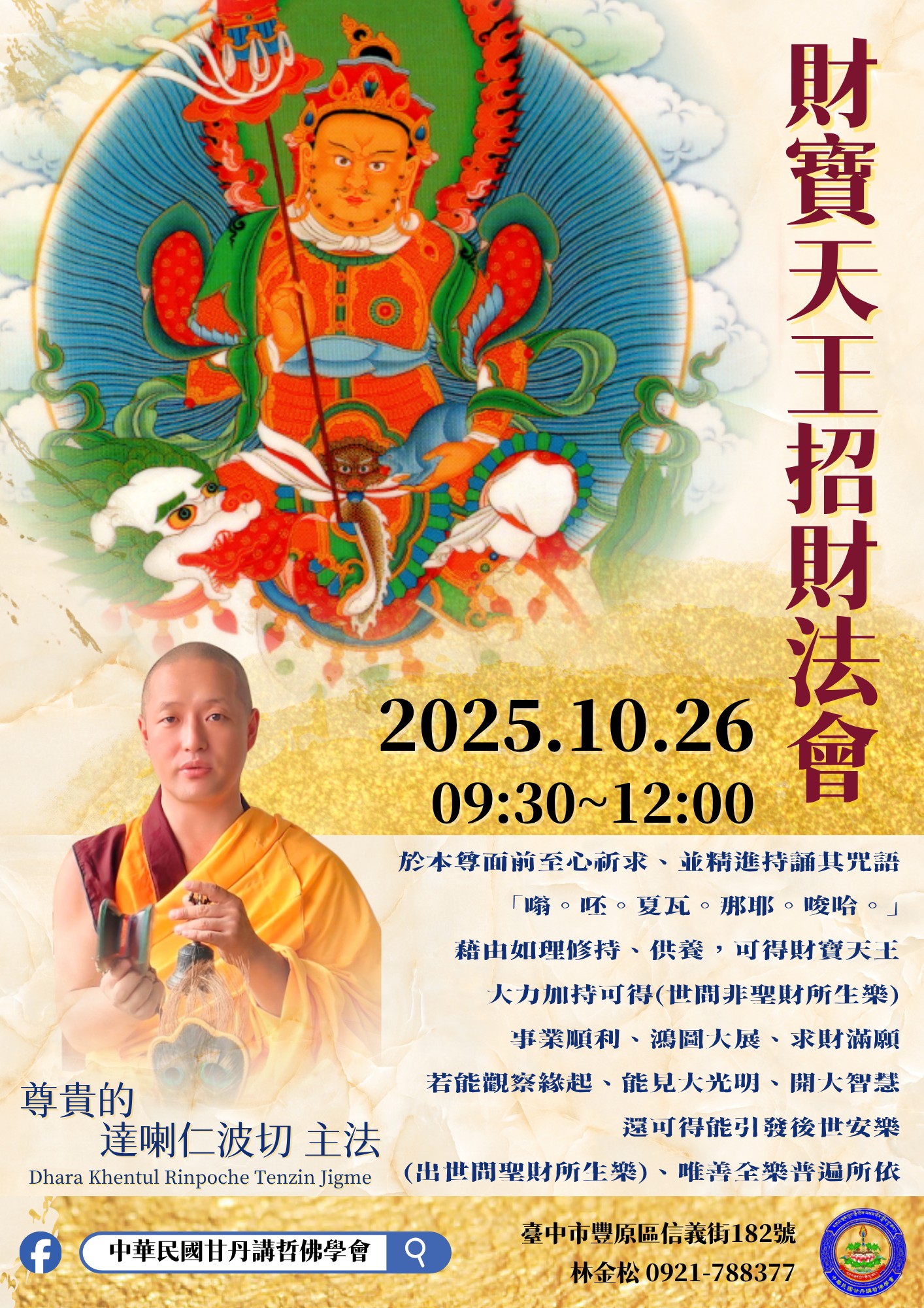 10月26日豐原財寶天王招財法會 主法上師:尊貴達喇仁波切丹增吉美 格魯 法會 2025/10/26 Facebook 相關資訊 友善列印 上一篇:斷法.空行笑聲儀軌唱誦與法器使用法教學 下一篇:上師與觀音無別瑜伽 閉關 精選法訊 11/23-30歲末迎新一年一度安太歲法 2025/10/23~2025/11/30 噶舉 法會 白雅仁波切圓寂三周年紀念法筵 2025/10/24 寧瑪 灌頂 寶上師2025年10月法筵 2025/10/24~2025/10/28 寧瑪 法會 伏魔洲伏藏『施身法之紅施』教授 1 2025/10/24 寧瑪 教學 2025八德佛堂7-12行事曆 2025/10/25~2025/12/29 寧瑪 共修 經續法林2025年度寶瓶修法 2025/10/25~2025/11/22 格魯 法會 「格薩智慧大士上師瑜珈加持法」給薩財神 2025/10/25 寧瑪 法會 多傑綽洛&敦請八部護法行事業會供灌頂 2025/10/25 寧瑪 灌頂 喇嘛網| Facebook 全球慈悲智慧數位佛學院 全球藏傳佛教最新弘法訊息﹝ Google全球第一資訊同步 ﹞