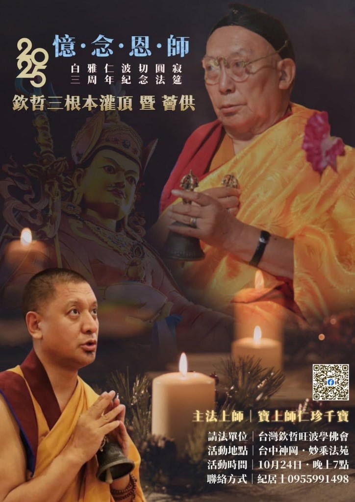 白雅仁波切圓寂三周年紀念法筵 主法上師:寶上師仁珍千寶 寧瑪 灌頂 2025/10/24 尊貴噶陀仁珍千寶仁波切 憶 念 恩 師 白雅仁波切圓寂三周年紀念法筵 欽哲三根本灌頂 曁 薈供 主法上師:寶上師仁珍千寶 請法單位:台灣欽哲旺波學佛會 活動地點:台中神岡·妙乘法苑 活動時間:10月24日(五) 晚上7點 聯絡方式:紀居士0955991498 友善列印 上一篇:上師與觀音無別瑜伽 閉關 精選法訊 斷法.空行笑聲儀軌唱誦與法器使用法教學 2025/10/12~2025/10/26 寧瑪 教學 2025年 10月 德威仁波切 主法法會 2025/10/17~2025/10/29 寧瑪 法會 天龍八部護法&酬供食子製作教授 2025/10/17 寧瑪 教學 財寶天王法會 2025/10/18 格魯 法會 10/18《地藏·蓮師速降加持雨法會》 2025/10/18 寧瑪 法會 放生息災延壽法會 2025/10/18 寧瑪 放生 2025龍王地基主酬懺灌頂法會 2025/10/19 薩迦 灌頂 白雅仁波切圓寂三周年紀念法筵 2025/10/24 寧瑪 灌頂 喇嘛網| Facebook 全球慈悲智慧數位佛學院 全球藏傳佛教最新弘法訊息﹝ Google全球第一資訊同步 ﹞