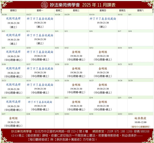 妙法樂苑11~12月課表 主法上師:尊貴熹嘉仁波切 格魯 課程 2025/11/01~2025/12/31 第5世熹嘉祖古仁波切 妙法樂苑【11~12月課表】已上架官網~ 11月 https://miaofa.tw/curriculum.php?YM=202511 12月 https://miaofa.tw/curriculum.php?YM=202512 每一次上課時,您可以直接點擊當日課程的【→】圖示,就能直接進入網路教室聽聞學習。 願我生生遇明師, 飽餐妙法甘露味, 十地五道功德滿, 速疾證得金剛持。 妙法樂苑佛學會 合十 友善列印 下一篇:慈悲僧伽11月法訊公告 精選法訊 台灣佛法顯密洲佛學會2025.10月法訊 2025/10/24~2025/10/31 寧瑪 課程 『大悲救苦自解脫』大灌頂及儀軌傳授 2025/10/24~2025/10/26 寧瑪 修行 寶上師2025年10月法筵 2025/10/24~2025/10/28 寧瑪 法會 2025八德佛堂7-12行事曆 2025/10/25~2025/12/29 寧瑪 共修 經續法林2025年度寶瓶修法 2025/10/25~2025/11/22 格魯 法會 「格薩智慧大士上師瑜珈加持法」給薩財神 2025/10/25 寧瑪 法會 多傑綽洛&敦請八部護法行事業會供灌頂 2025/10/25 寧瑪 灌頂 10月26日豐原財寶天王招財法會 2025/10/26 格魯 法會 喇嘛網| Facebook 全球慈悲智慧數位佛學院 全球藏傳佛教最新弘法訊息﹝ Google全球第一資訊同步 ﹞