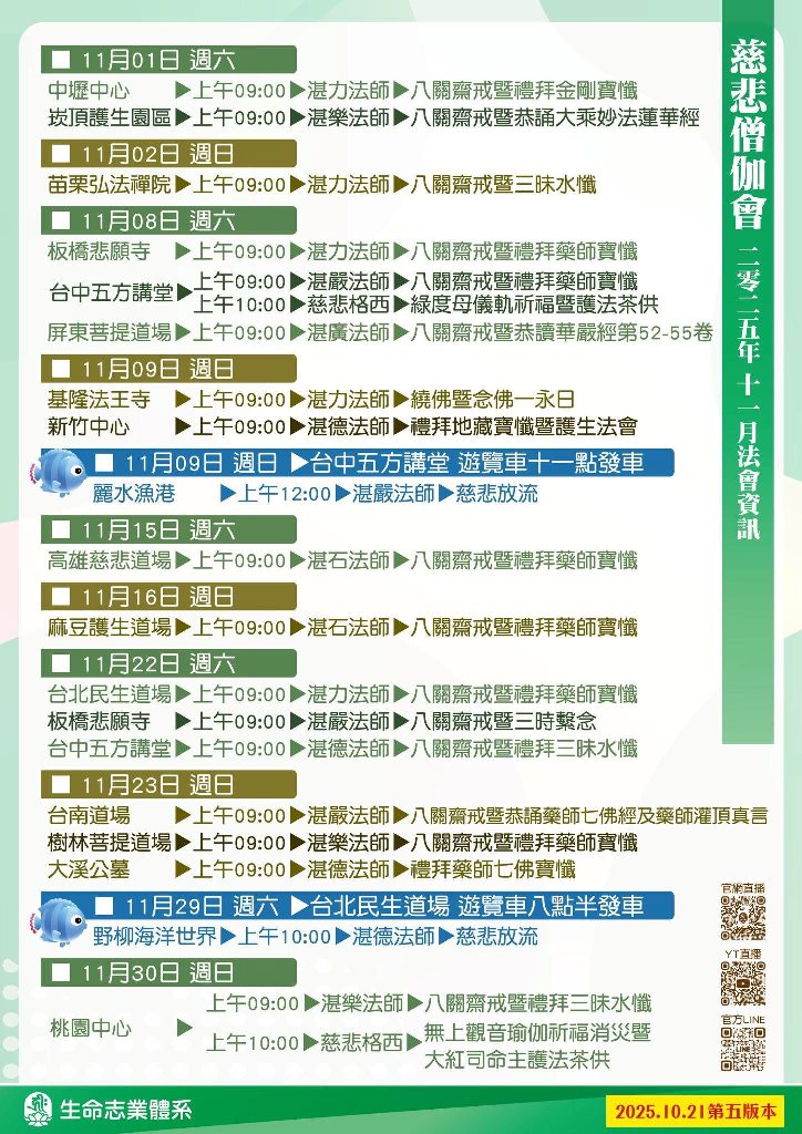 慈悲僧伽11月法訊公告 顯教 法會 2025/11/01~2025/11/30 慈悲僧伽2025年11月法訊公告 法會備有免費消災超薦牌位填寫 敬邀菩薩大德踴躍前往參加,同霑法益,共沐佛恩 友善列印 上一篇:妙法樂苑11~12月課表 下一篇:彰化弘願念佛會2026年行事曆 精選法訊 台灣佛法顯密洲佛學會2025.10月法訊 2025/10/24~2025/10/31 寧瑪 課程 『大悲救苦自解脫』大灌頂及儀軌傳授 2025/10/24~2025/10/26 寧瑪 修行 寶上師2025年10月法筵 2025/10/24~2025/10/28 寧瑪 法會 2025八德佛堂7-12行事曆 2025/10/25~2025/12/29 寧瑪 共修 經續法林2025年度寶瓶修法 2025/10/25~2025/11/22 格魯 法會 「格薩智慧大士上師瑜珈加持法」給薩財神 2025/10/25 寧瑪 法會 多傑綽洛&敦請八部護法行事業會供灌頂 2025/10/25 寧瑪 灌頂 10月26日豐原財寶天王招財法會 2025/10/26 格魯 法會 喇嘛網| Facebook 全球慈悲智慧數位佛學院 全球藏傳佛教最新弘法訊息﹝ Google全球第一資訊同步 ﹞