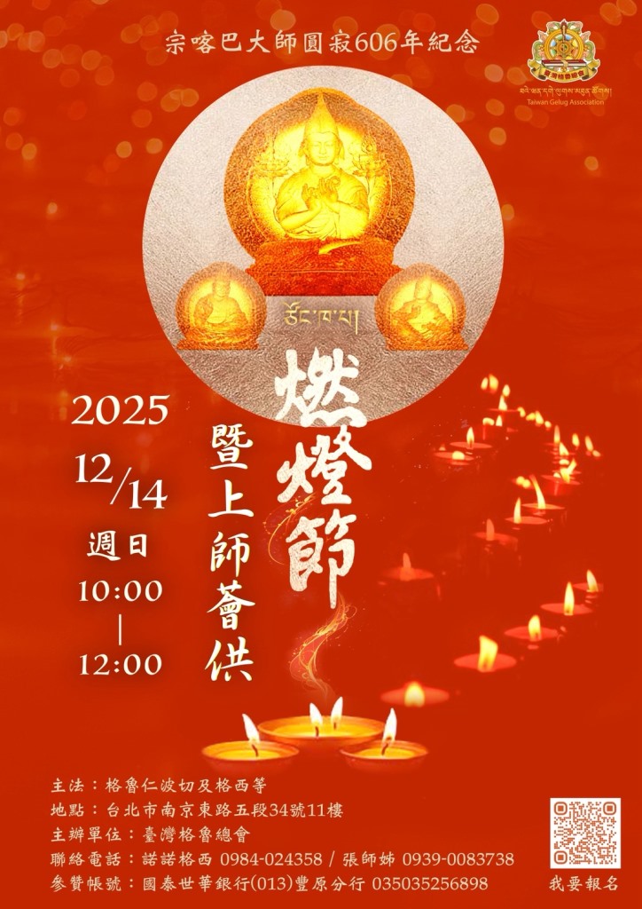 臺灣格魯總會2025燃燈節暨上師薈供 格魯 法會 2025/12/14 2025年燃燈節暨上師薈供法會 謹訂於114年12月14日(日) 上午10:00舉行 法會備有消災超薦牌位 歡迎踴躍參加 隨喜參贊 同霑法益 共沐法喜 表單連結 https://forms.gle/bWXLF1dBZqPVNfLg6 友善列印 上一篇:祭龍食子&龍煙供法會 下一篇:秋林傳承普巴金剛灌頂除障大法會 精選法訊 蘇曼噶舉高雄中心 2026年 光明點燈 2025/11/02~2026/02/28 噶舉 其它 11/7-11/9頂髻尊勝佛母千供延壽 2025/11/07~2025/11/09 噶舉 法會 祭龍食子&龍煙供法會 2025/11/07 格魯 法會 2025年蓮師滿願塔‧博達佛塔─盛大供燈 2025/11/08~2025/11/11 薩迦 共修 2025年11月熹嘉仁波台灣弘法 2025/11/08~2025/11/23 格魯 法會 熹嘉仁波切金剛經口傳暨教授課程 2025/11/08~2025/12/07 格魯 課程 天降日報恩培福大法會 2025/11/10~2025/11/11 寧瑪 法會 2025佐欽大圓滿【佛陀天降月】法會 2025/11/11 寧瑪 法會 喇嘛網| Facebook 全球慈悲智慧數位佛學院 全球藏傳佛教最新弘法訊息﹝ Google全球第一資訊同步 ﹞
