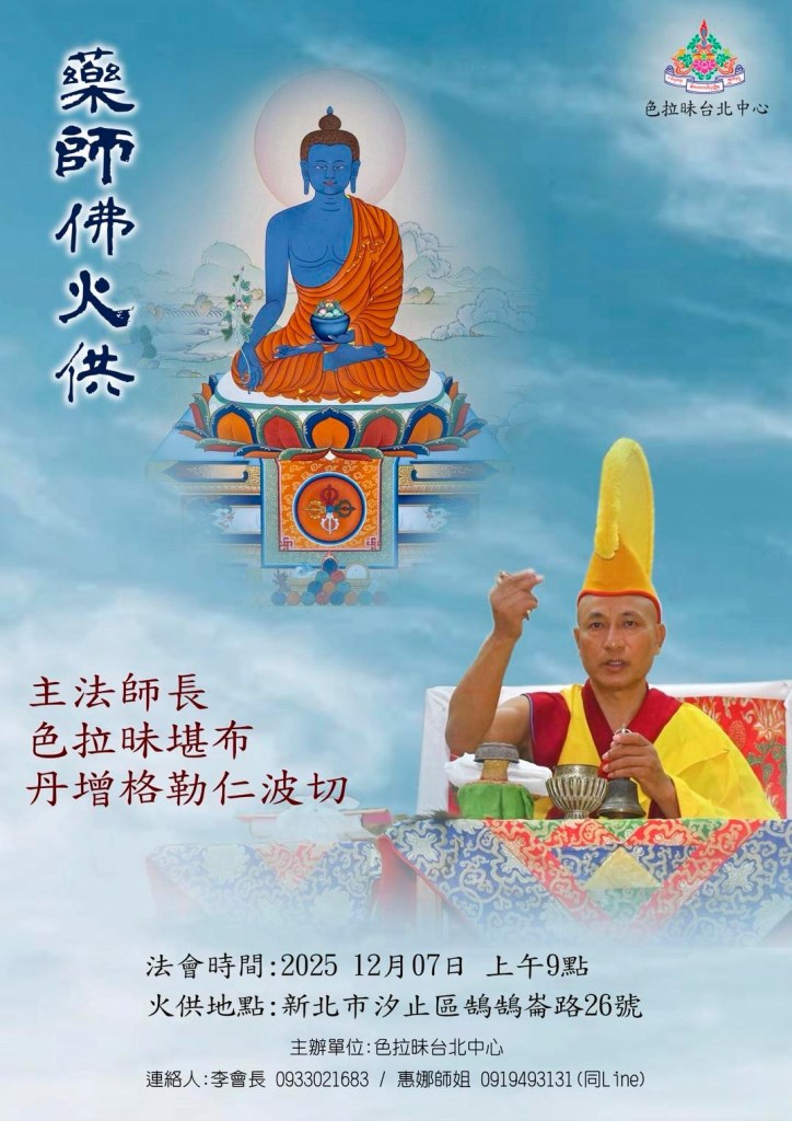 煙供法會&藥師佛火供 主法上師:色拉昧堪布 丹增格勒仁波切 格魯 法會 2025/12/06~2025/12/07 尊貴 丹增格勒仁波切 煙供法會&藥師佛火供 色拉昧台北中心 主法師長:色拉昧堪布 丹增格勒仁波切 煙供時間:2025 12月 06日 上午10點 火供時間:2025 12月 07日 上午9點 地點:新北市汐止區鵠鵠崙路26號 主辦單位:色拉昧台北中心 連絡人:李會長0933021683 / 惠娜師姐0919493131(同Line) 相關資訊 友善列印 上一篇:大威德金剛火供法會 下一篇:經續法林12月課程表 精選法訊 伏魔洲『施身法之紅施』同修法會 2025/12/09 寧瑪 法會 佛陀舍利曁寶篋印陀羅尼經塔落成典禮供佛 2025/12/10~2026/02/10 顯教 法會 甘丹文殊2026點亮心燈〜年度光明燈 2025/12/10~2026/04/30 格魯 其它 12/12 超渡・正法極深密意法會 2025/12/12 噶舉 法會 秋林傳承普巴金剛灌頂除障大法會 2025/12/13~2025/12/14 噶舉 法會 象鼻財神·忿怒蓮師馬鵬熾燃歲末除障法會 2025/12/13~2025/12/14 寧瑪 法會 12/13《噶舉證道歌》 2025/12/13 噶舉 法會 臺灣格魯總會2025燃燈節暨上師薈供 2025/12/14 格魯 法會 喇嘛網| Facebook 全球慈悲智慧數位佛學院 全球藏傳佛教最新弘法訊息﹝ Google全球第一資訊同步 ﹞
