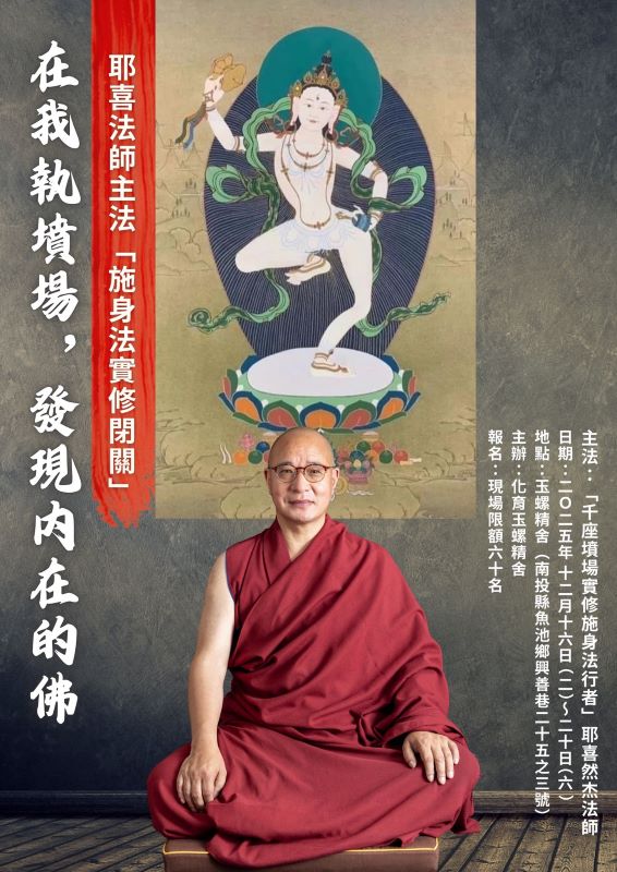這就是12月16日(二)到20日(六),在南投縣魚池鄉日月潭附近的化育修行村「玉螺精舍」舉行的「施身法實修」,將由耶喜然杰喇嘛帶領實修,並分享實修經驗與竅訣,還要說說能激勵修行士氣的施身法小故事,邀請您參加,名額有限,現場只有60名,請即報名。