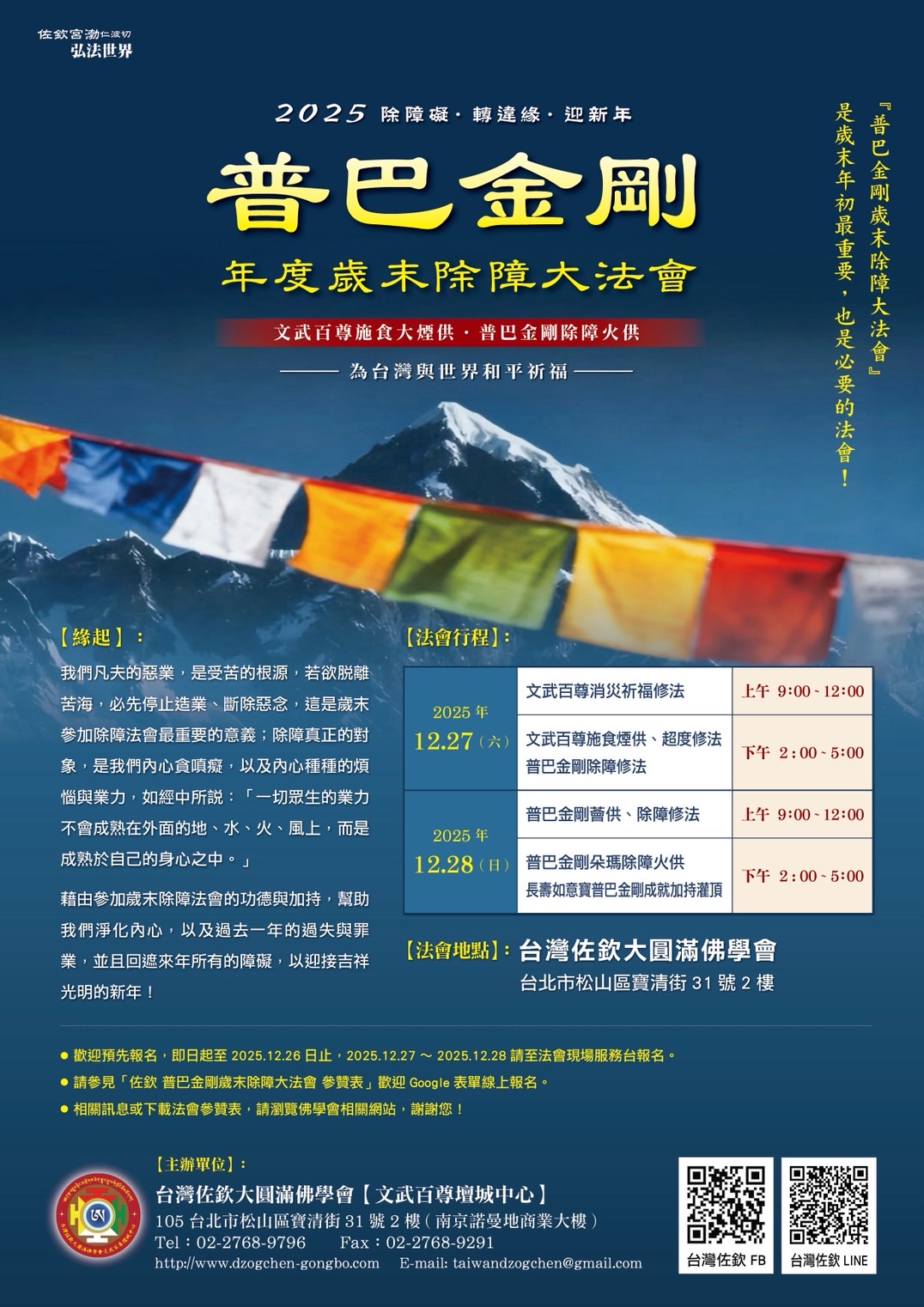 ● 歡迎預先報名,即日起至2025.12.26日止,2025.12.27~2025.12.28請至法會現場服務台報名。