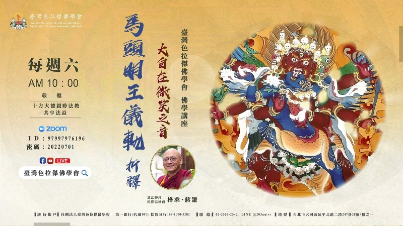 每週六早上十點同步教學於佛學會現場、ZOOM、Facebook、Youtube,敬邀十方大德親聆法教,把握請益善知識的殊勝因緣,與色拉傑寺院僧眾結上吉祥法緣,法益均霑。