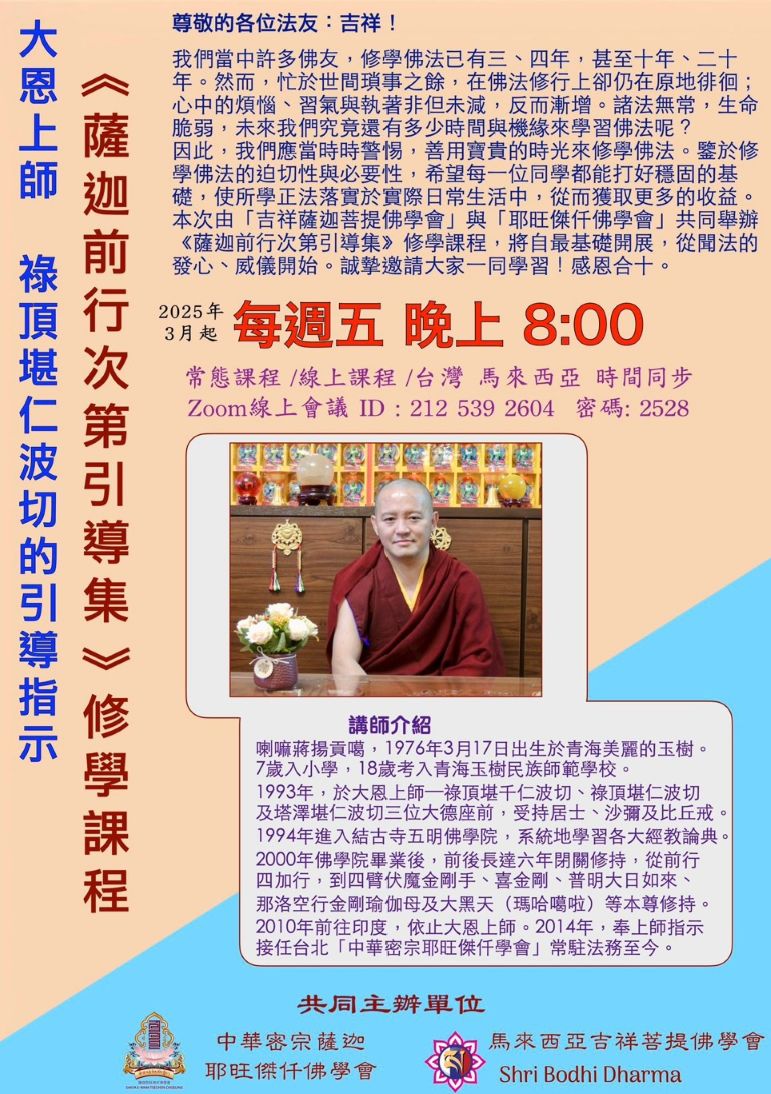 辭舊迎春除障祈福法會 主法上師:喇嘛蔣揚貢噶 薩迦 法會 2026/02/08~2026/03/03 喇嘛 蔣揚貢噶 中華密宗耶旺傑仟佛學會 辭舊迎春除障祈福法會 感恩諸位金剛師兄、法友們一路走來的護持與發心。在上師三寶慈悲加持下,所行所遇,一切隨順因緣。本中心為因應法務發展需求,中心會址已遷移至: 「基隆市中正區和豐街213號1樓」,特此公告,敬請各位金剛法友們悉知留意。 為祈願中心法務事業,圓滿順利,將舉辦一系列法會、實修閉關等課程,誠摯邀請諸位法友隨喜參贊、共植福田。 友善列印 上一篇:新春蓮師財神祈福暨蓮師總集煙供法會 精選法訊 徵求「風馬旗暨六字真言經幡」懸掛功德主 2026/01/25~2026/05/31 噶舉 法會 2026白瑪哈嘎拉大火供 2026/01/26 薩迦 火供 新春祈福納財 消災除障法會 2026/01/28~2026/02/01 噶舉 法會 1月28日蓮師薈供-三寶總攝 2026/01/28 噶舉 共修 歲末瑪哈嘎拉暨七祿除障大法會 2026/01/30~2026/02/01 噶舉 法會 大圓滿灌頂、教學 2026/01/31 寧瑪 灌頂 薩迦普拉仁波切台北中心1-2月法訊 2026/01/31~2026/02/28 薩迦 法會 貝林傳承不共之寶海蓮師灌頂 2026/01/31 寧瑪 灌頂 喇嘛網| Facebook 全球慈悲智慧數位佛學院 全球藏傳佛教最新弘法訊息﹝ Google全球第一資訊同步 ﹞