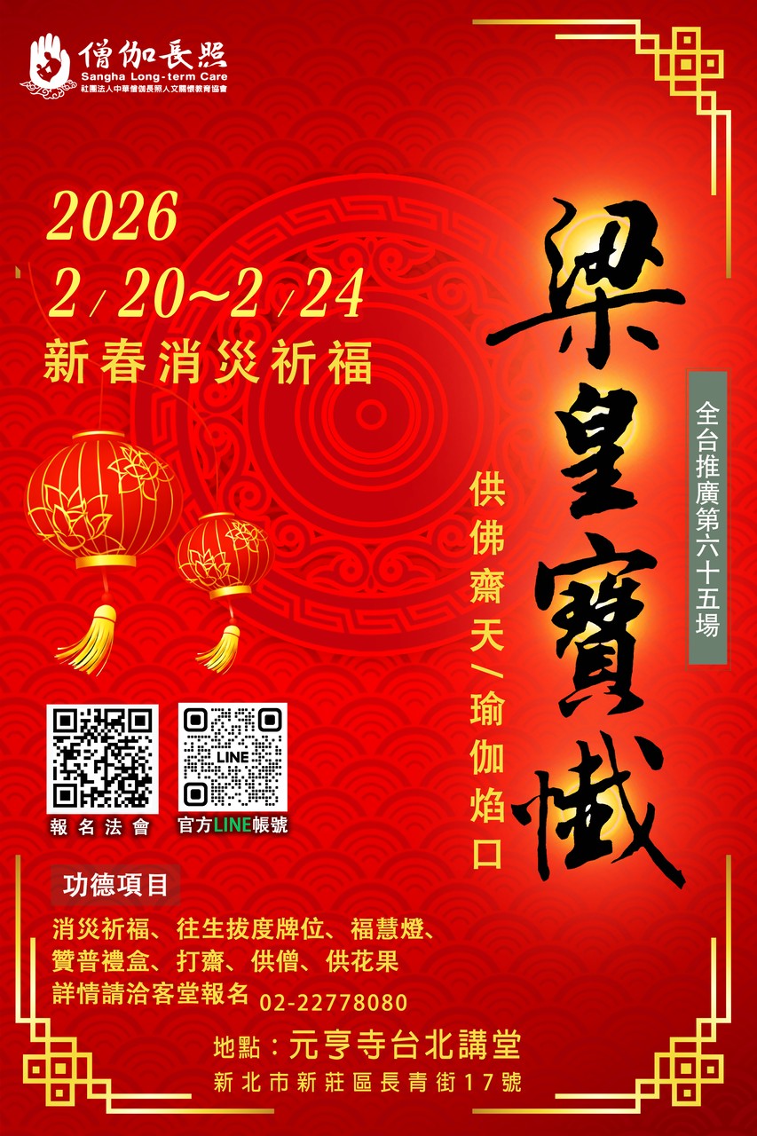 僧伽長照-115年新春祈福法會 顯教 法會 2026/02/20~2026/02/24 僧伽長照-115年新春祈福法會 全臺推廣第六十五場梁皇寶懺法會(2/20-2/24元亨寺台北講堂) 《梁皇寶懺》供佛齋天、瑜伽焰口 法會地點: 元亨寺北講堂(新北市新莊區長青街17號) 活動洽詢:僧伽長照 02-22778080 法會牌位登記: https://www.beclass.com/rid=305256d6983b5437477e 法師報名: https://www.beclass.com/rid=305256d6983b4a82b192 友善列印 上一篇:《生生不息–喜馬拉雅當代藝術》展覽 精選法訊 台灣佛法顯密洲佛學會2026.1月法訊 2026/02/05~2026/02/20 寧瑪 灌頂 密乘戒之講解與實修 2026/02/05~2026/02/07 格魯 課程 大方廣佛學講修學會 歲末除障法會 2026/02/07~2026/02/08 寧瑪 法會 歲末獅面空行母除障暨紅財神納福法會 2026/02/07 寧瑪 法會 大方廣佛學講修學會 歲末除障法會 2026/02/07~2026/02/08 寧瑪 法會 2/7馬頭明王‧長壽佛除魔淨障大法會 2026/02/07 寧瑪 法會 台灣大圓滿禪定佛學會2026二月活動行程 2026/02/07~2026/02/13 寧瑪 法會 巴楚【獅面空行母、紅財神納福法會】 2026/02/07 寧瑪 法會 喇嘛網| Facebook 全球慈悲智慧數位佛學院 全球藏傳佛教最新弘法訊息﹝ Google全球第一資訊同步 ﹞