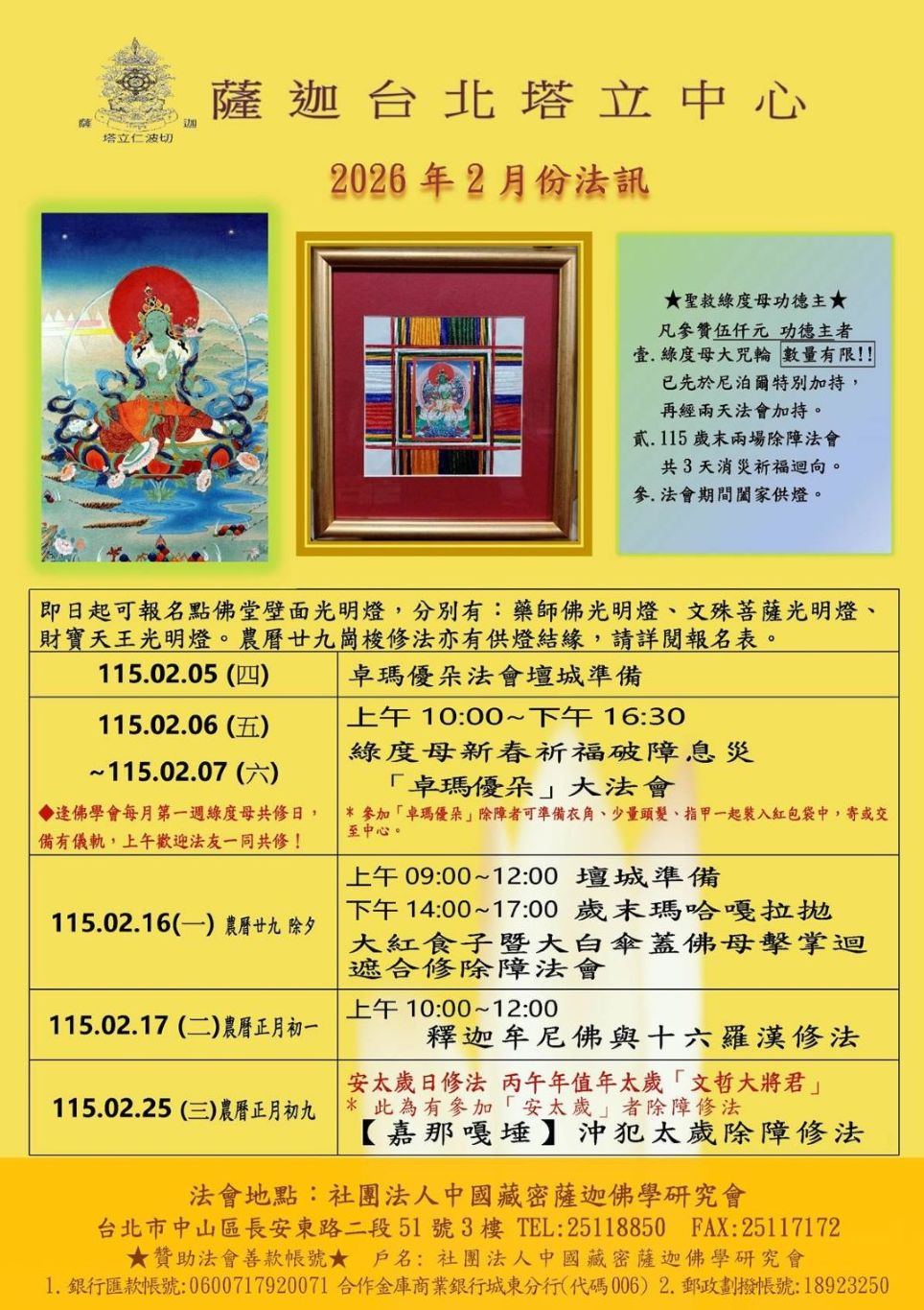 薩迦台北塔立中心2月份法訊 薩迦 法會 2026/02/05~2026/02/25 薩迦台北塔立中心 2026年2月份法訊 法會地點:社團法人中國藏密薩迦佛學研究會 台北市中山區長安東路二段51號3樓 TEL:25118850 FAX:25117172 友善列印 上一篇:尊勝佛母百供延壽法會&煙供法會 精選法訊 台灣佛法顯密洲佛學會2026.1月法訊 2026/02/07~2026/02/20 寧瑪 灌頂 大方廣佛學講修學會 歲末除障法會 2026/02/07~2026/02/08 寧瑪 法會 大方廣佛學講修學會 歲末除障法會 2026/02/07~2026/02/08 寧瑪 法會 台灣大圓滿禪定佛學會2026二月活動行程 2026/02/07~2026/02/13 寧瑪 法會 堪布貝瑪圖登岡-波巴四法教授 2026/02/07~2026/03/08 噶舉 課程 金剛盔甲灌頂過年蓮師大殿普巴長壽財神法會 2026/02/08~2026/02/19 寧瑪 法會 2/8普巴金剛‧瑪哈嘎拉替身贖命大法會 2026/02/08 寧瑪 法會 宗薩遍喜自在學佛會2月法訊 2026/02/09~2026/03/01 薩迦 法會 喇嘛網| Facebook 全球慈悲智慧數位佛學院 全球藏傳佛教最新弘法訊息﹝ Google全球第一資訊同步 ﹞