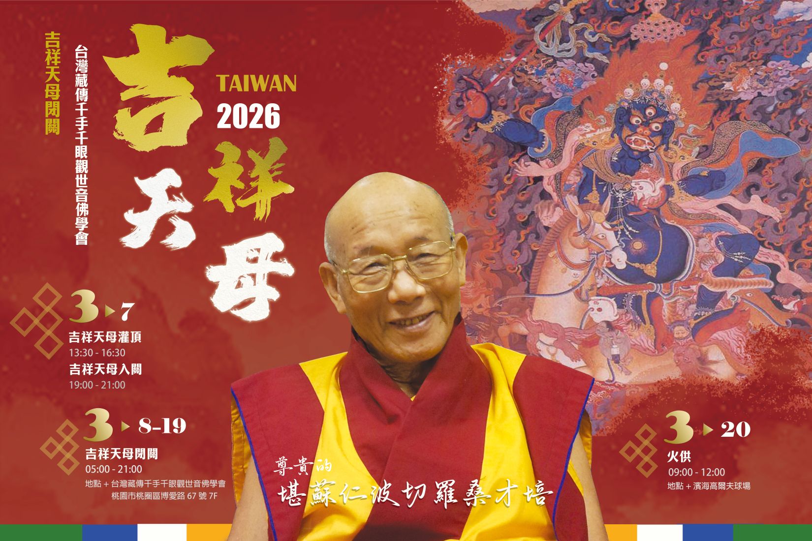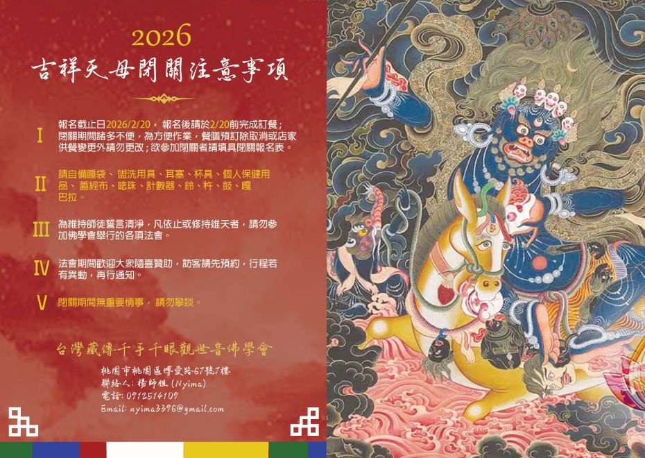 吉祥天母灌頂&閉關 主法上師:尊貴 羅桑才培 格魯 閉關 2026/03/07~2026/03/19 尊貴羅桑才培堪仁波切 台灣藏傳千手千眼觀世音佛學會 吉祥天母灌頂及閉關 尊貴的 堪蘇仁波切羅桑才培 吉祥天母灌頂 13:30 - 16:30 吉祥天母入關 19:00 - 21:00 吉祥天母閉關 05:00 - 21:00 地點:台灣藏傳千手千眼觀世音佛學會 (桃園市桃圈區博愛路67號7F) 友善列印 上一篇:普陀禪林-丙午新春祈福光明法會 下一篇:大手印禪修引導 精選法訊 台灣佛法顯密洲佛學會2026.1月法訊 2026/02/09~2026/02/20 寧瑪 灌頂 宗薩遍喜自在學佛會2月法訊 2026/02/09~2026/03/01 薩迦 法會 2/15(日)米滂仁波切之『給薩王』灌頂 2026/02/09~2026/02/15 寧瑪 灌頂 2026年2月11日空行母會薈供日 2026/02/11 噶舉 共修 2025農曆歲末除障法會 2026/02/13~2026/02/27 寧瑪 法會 歲末除障暨新春祈福大法會 2026/02/13~2026/02/18 格魯 法會 2026年化解太歲必修! 2026/02/14 薩迦 法會 2026度母破陣除障法會 2026/02/14~2026/02/16 薩迦 法會 喇嘛網| Facebook 全球慈悲智慧數位佛學院 全球藏傳佛教最新弘法訊息﹝ Google全球第一資訊同步 ﹞