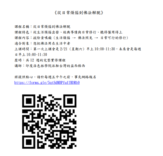 在忙碌、壓力與情緒交織的日常生活中,我們常被貪、嗔、癡牽引,反覆經歷焦慮、憤怒與迷惘。本課程以生活中真實的煩惱為起點,由具備完整佛學訓練的藏傳佛教益西格西 (來自印度哲蚌洛色林佛學院),引導學員透過經典導讀與實修方法,學習如何在日常中運用佛法,逐步鬆動內心的執著與痛苦。