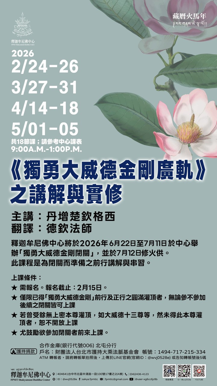 僧伽長照-115年埔里社區法華經共修 顯教 共修 2026/03/22~2026/12/27 僧伽長照-115年埔里社區法華經共修 僧伽長照-115年埔里社區據點 法華經共修(115/3月-12月法師報名系統) 埔里社區據點 法華經共修 恭誦《法華經》 共修日期:115年3/22、4/12、5/24、6/28、7/12、8/2、9/27、10/11、11/1、12/27 共修地點:佛光寺(南投縣埔里鎮觀音路81號) https://www.beclass.com/rid=3052573698bd0a32c577 友善列印 上一篇:天津桑波堪仁波切-度母破陣除障祈福大法會 精選法訊 宗薩遍喜自在學佛會新春法讯 2026/02/15~2026/03/01 薩迦 法會 台北市大乘林佛學會歲末除障法會 2026/02/16 格魯 法會 孔雀山祖庭開成禪寺新春祈福法會 2026/02/17~2026/02/20 顯教 法會 2026 佐欽【新年招財納福法會】 2026/02/17~2026/02/22 寧瑪 法會 煙供.白度母長壽法會&迎財神 2026/02/17~2026/02/21 薩迦 法會 115年新春護國梁皇齊天大法會 2026/02/17~2026/02/25 顯教 法會 藏暦火馬年新春團拜&無等妙香廣大煙供 2026/02/17~2026/02/19 格魯 法會 2026《新年祈福暨21財神總集法會》 2026/02/17 寧瑪 法會 喇嘛網| Facebook 全球慈悲智慧數位佛學院 全球藏傳佛教最新弘法訊息﹝ Google全球第一資訊同步 ﹞