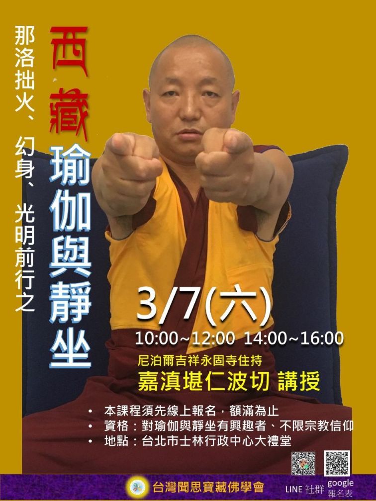 •嘉滇堪仁波切為尼泊爾吉祥永固寺住持及全球覺醒金剛組職(Awakening Vajra International)負責人,師承西藏瑜伽禪修大師尊貴卻殿仁波切多年,精通藏語、英語並可以華語、印度語教學、溝通,多年來已在美洲、澳洲、亞洲等世界各地推廣本系列課程,學員資格為對瑜伽與靜坐有興趣者、不限於年齡與宗教信仰(16歲以下須由家長陪同)。