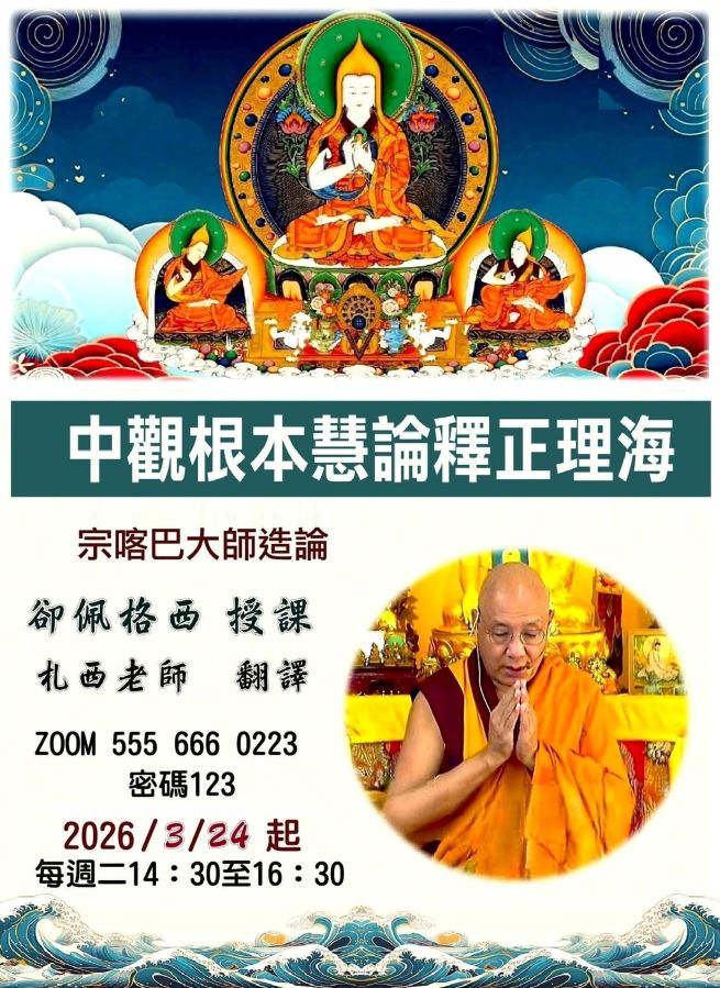 中觀根本慧論釋正理海 主法上師:卻佩格西 格魯 課程 2026/03/24~2026/04/30 尊貴洛桑卻佩格西 法友們吉祥如意! 很歡喜的與您分享一則殊勝的新課程法訊~ 中觀根本慧論釋正理海 卻佩格西•授課 札西老師•翻譯 文稿小組•請法 2026/3/24(二)起 每週二下午 14:30至16:30 ZOOM_5556660223 密123 友善列印 上一篇:上師蓮花皇&金剛鎧甲灌頂、21瑜伽冥想課 下一篇:2026 高雄藥師佛灌頂、度亡暨七佛供養 精選法訊 廣論研修會 2026/03/09~2026/04/30 格魯 課程 2026 明就仁波切台灣弘法行程 2026/03/10~2026/07/04 噶舉 法會 伏魔金剛手灌頂/教學&金剛瑜珈母教學 2026/03/12~2026/03/28 薩迦 灌頂 2026法鼓山第廿九屆在家菩薩戒 2026/03/12~2026/03/22 顯教 修行 僧伽長照-115年新竹法華經共修 2026/03/13~2026/03/14 顯教 法會 空行母薈供日 2026/03/13 噶舉 共修 雲林蓮師大殿-21度母及金剛爪母灌頂 2026/03/14~2026/03/15 寧瑪 灌頂 「和平共榮,向上向善渡馬年」 和平講座 2026/03/14 利美 演講 喇嘛網| Facebook 全球慈悲智慧數位佛學院 全球藏傳佛教最新弘法訊息﹝ Google全球第一資訊同步 ﹞