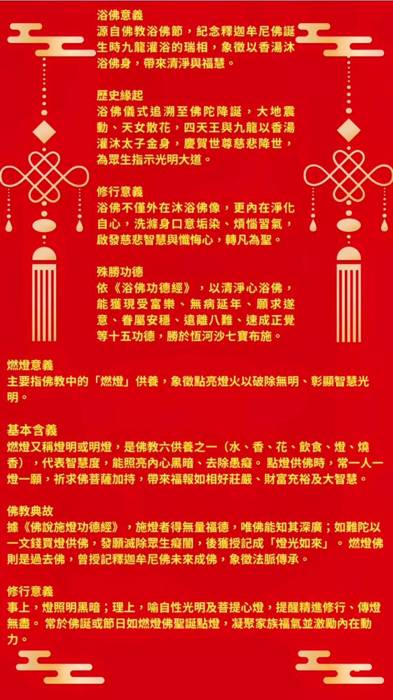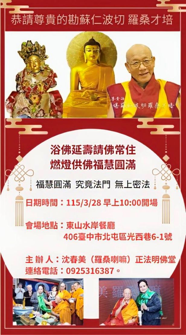 浴佛延壽請佛常住.燃燈供佛福慧圓滿 主法上師:尊貴的堪蘇仁波切 羅桑才培 格魯 法會 2026/03/28 尊貴羅桑才培堪仁波切 恭請尊貴的堪蘇仁波切 羅桑才培 浴佛延壽請佛常住 燃燈供佛福慧圓滿 福慧圓滿 究竟法門 無上密法 日期時間:115/3/28 早上10:00開場 會場地點:東山水岸餐廳 (臺中市北屯區光西巷6-1號) 主辦人:沈春美(羅桑喇嘛)正法明佛堂 連絡電話:0925316387 友善列印 上一篇:大方廣【2023清明報恩法會】 下一篇:《密宗道次第廣論》口傳暨吉祥圓滿上師薈供 精選法訊 2026堪布拉布4日閉關禪修營 2026/03/15~2026/04/27 噶舉 閉關 3/15〜大威德金剛自入壇城法會 2026/03/15~2026/04/05 格魯 法會 3月份週日共修-台北市祇園佛學會 2026/03/15~2026/03/29 噶舉 共修 破妄七日關 (免費) 2026/03/17~2026/04/23 噶舉 閉關 霞瑪道次第禪修引導 2026/03/18~2026/03/21 格魯 課程 孔雀山開成禪寺 第九屆短期出家體驗營 2026/03/18~2026/05/31 顯教 修行 西蓮淨苑 2026年佛法思修班 2026/03/18~2026/04/30 顯教 課程 貝諾法王涅槃紀念日文武百尊上師薈供大法會 2026/03/19~2026/03/28 寧瑪 法會 喇嘛網| Facebook 全球慈悲智慧數位佛學院 全球藏傳佛教最新弘法訊息﹝ Google全球第一資訊同步 ﹞