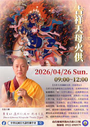 中華民國甘丹講哲佛學會誠摯邀請您,共同參與具備極大加持力的 「吉祥天母火供法會」。吉祥天母是綠度母的忿怒化身,也是藏傳佛教中威猛靈感的守護神。透過烈火焚化供品上供本尊與護法、下施眾生,能快速摧毀魔擾、病苦與一切違緣,被譽為「滿願尊」與「第一大空行護法」。