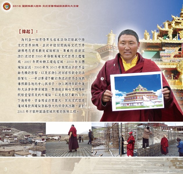 文武百尊壇城時經11年的光陰建設,將於今年2016年蓮師殊勝的火猴本命年2016.07.08~10吉祥日舉行三天的開光大法會與文武百尊灌頂法會,法會邀請佐欽寺全體僧眾修法,為所有功德主及一切眾生祈福回向,並對其累劫冤親債主作超度回向,祝願所有功德主家庭、事業、健康、情感都順利圓滿吉祥!一切眾生都能獲得暫時安樂和究竟的解脫,早日證得佛陀果位!