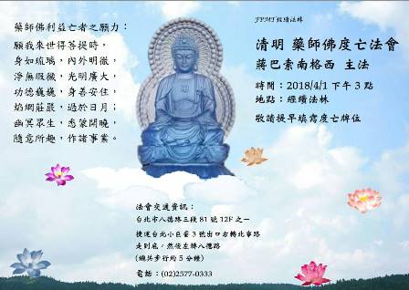 清明 藥師佛度亡法會 主法上師:蔣巴索南格西 格魯 法會 2018/04/01 蔣巴索南格西 4/1(日)下午3:00 清明 藥師佛度亡法會 主法上師:蔣巴索南格西 經續法林 (FPMT 臺北中心) 地址:臺北市松山區八德路三段81號12樓之一 電話:02-25770333 傳真:02-25770510 華南銀行008中崙分行/帳號116-20-041-7796 〈轉帳後請傳真或e-mail或來電告知末四碼〉 郵局劃撥:財團法人台北市護持大乘法脈基金會 劃撥帳號:18812150 友善列印 上一篇:清明渡亡 阿彌陀佛法會 下一篇:4/1(日)山淨煙供暨紅閻魔敵共修 精選法訊 2025/2026跨年法筵 2025/12/27~2026/01/04 寧瑪 法會 下密院前校長 慈仁格西《修心七義》 2025/12/27~2025/12/28 格魯 演講 2025佐欽《普巴金剛歲末除障大法會》 2025/12/27~2025/12/28 寧瑪 法會 空行心滴會供&超度法會(請帶會供食飲) 2025/12/27 寧瑪 法會 第33屆護國息災祈福念佛(蒙山施食)大法會 2025/12/28 顯教 法會 洛色林佛學院-尊者90華誕恭祝典禮&研討會 2025/12/28~2026/01/01 格魯 研討 尊者90華誕《法王的偉大事業》《入行論》為題不分教 2025/12/28~2026/01/01 格魯 學術 宗薩遍喜自在佛學會八關齋戒&共修觀音法 2025/12/28 薩迦 法會 喇嘛網| Facebook 全球慈悲智慧數位佛學院 全球藏傳佛教最新弘法訊息﹝ Google全球第一資訊同步 ﹞