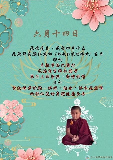 色拉寺洛巴康村-薩嘎達瓦上師薈供暨供僧齋僧 格魯 法會 2022/06/14 2022年6月14日 薩嘎達瓦,藏曆四月十五 是顛津嘉顛仁波切(卻殿仁波切轉世)生日,祈願仁波切身體健康長壽, 將於 色拉寺洛巴康村上師薈供、齋僧供僧 尼泊爾吉祥永固寺上師薈供、齋僧供僧 拉薩覺沃佛前祈願,供燈、貼金、供衣莊嚴佛 薩嘎達瓦殊勝日上師薈供暨齋僧供僧法會參贊表 https://forms.gle/g1k7hMrK5ovTsdEP8 台中市講修增廣佛學會 友善列印 上一篇:達賴喇嘛尊者-勝海觀音灌頂.宗大師菩提道次第攝頌 下一篇:宗薩欽哲仁波切《佛法:印度的遺產》《究竟圓滿的智慧》 精選法訊 洛桑德勒堪蘇仁波切弘法行程 2025/12/22~2026/01/31 格魯 灌頂 妙法樂苑 12課程異動公告 2025/12/22~2025/12/31 格魯 課程 2025年·第四十屆噶舉祈願法會 2025/12/23~2026/01/03 噶舉 法會 『大白傘蓋佛母』迴遮除障驅邪同修法會 2025/12/23 寧瑪 學術 《玄奘大學VS唐康大樂法林》合作協議簽約典禮 2025/12/24 格魯 學術 快樂的人生藍圖 2025/12/24 格魯 演講 大威德金剛火供法會 2025/12/25 格魯 火供 2025/2026跨年法筵 2025/12/27~2026/01/04 寧瑪 法會 喇嘛網| Facebook 全球慈悲智慧數位佛學院 全球藏傳佛教最新弘法訊息﹝ Google全球第一資訊同步 ﹞