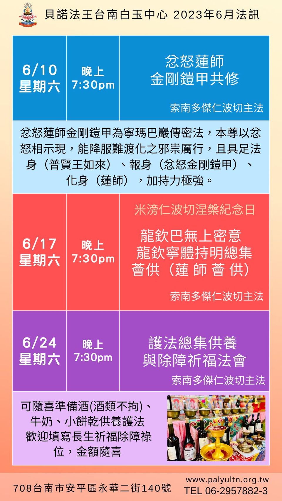 貝諾法王台南白玉中心6月法訊 主法上師:索南多傑仁波切 寧瑪 法會 2023/06/10~2023/06/24 尊貴索南多傑仁波切 貝諾法王台南白玉中心2023年6月法訊 索南多傑仁波切 主法 地址:台南市安平區永華二街140號 電話:06-2957882 友善列印 下一篇:藥師佛隨許暨《藥師七佛.勝諦讚》口傳法會 精選法訊 薩迦普拉仁波切台北中心1-2月法訊 2026/01/31~2026/02/28 薩迦 法會 大乘聞思洲佛學會財神法會 2026/02/01 格魯 法會 02/01 三根本十號供超渡法會 2026/02/01 噶舉 法會 二月一日普巴金剛新年除障法會大樂佛學會 2026/02/01 寧瑪 法會 經續法林2月課程表 2026/02/01~2026/02/28 格魯 法會 臺北市祇園佛學會-2月份週日共修 2026/02/01~2026/02/15 噶舉 共修 台北賢遍佛學會 2 月共修表 2026/02/01~2026/02/28 寧瑪 共修 台中釋迦牟尼佛中心 2月課程表 2026/02/01~2026/02/28 格魯 法會 喇嘛網| Facebook 全球慈悲智慧數位佛學院 全球藏傳佛教最新弘法訊息﹝ Google全球第一資訊同步 ﹞