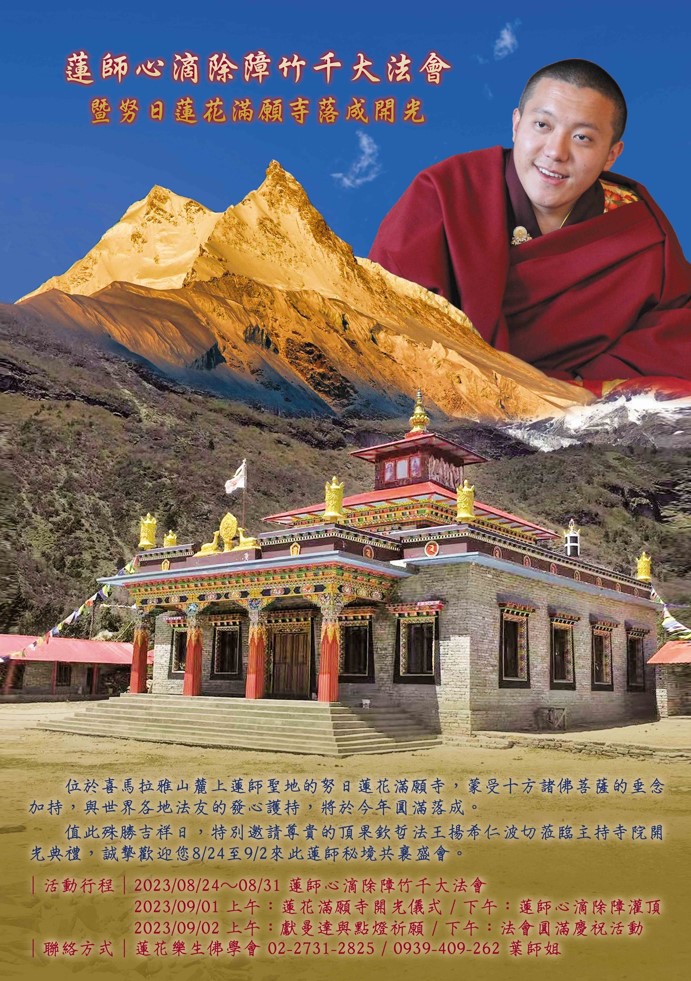 200多位來自喜馬拉雅山各地區的僧眾與瑜伽士,將於蓮師聖地為期八天日夜不間斷修誦《上師意之修法:障礙遍除口授心要如意寶珠》。此法是由大伏藏師秋吉林巴所取出的近傳承伏藏法,直接來自蓮師,是十億上師成就法的精華,能去除一切障礙,加持力大,成就更為迅速。蓮師出於廣大悲心,為身處濁世的眾生預先做了最好的安排,透過修持蓮師法門,一心一意向總攝三寶、三根本的蓮師祈請,是化解一切障礙衰落,成就一切善樂最有力的方式,法會期間大家可盡力持誦蓮師心咒。