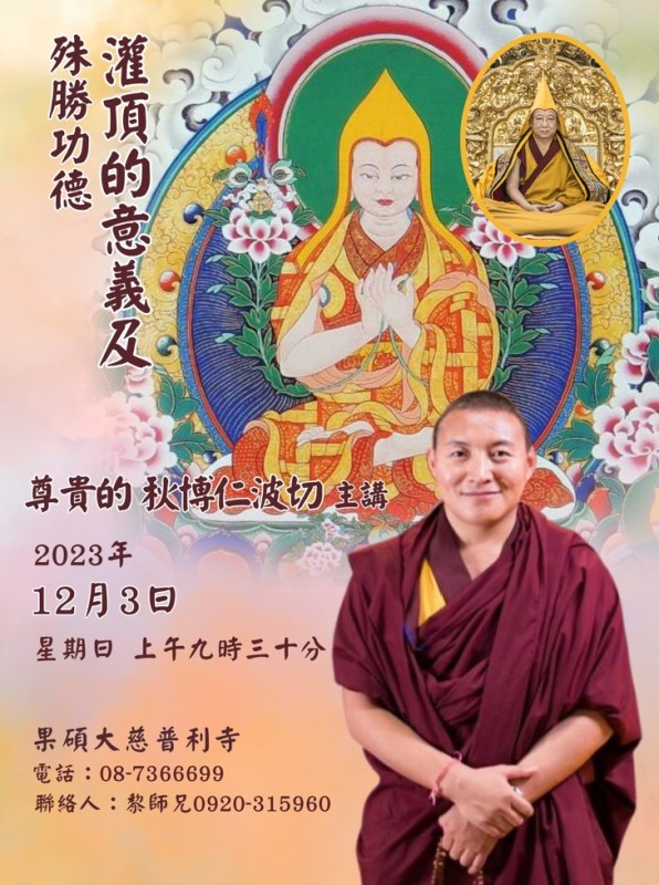 灌頂的意義及殊勝功德 主法上師:尊貴 秋博仁波切 格魯 演講 2023/12/03 尊貴 秋博仁波切 《佛學講座》 講授:灌頂的意義及殊勝功德 尊貴的 秋博仁波切 主講 時間:本週日(12/3)上午九時三十分 地點:果碩大慈普利寺 屏東縣長治鄉長興村長安街59號 電話:(08) 736-6699 相關資訊 友善列印 上一篇:地藏菩薩暨咕嚕咕咧祈福加持法會 下一篇:煉心.抄經—手抄《心經》及禪修 精選法訊 象鼻財神·忿怒蓮師馬鵬熾燃歲末除障法會 2025/12/13~2025/12/14 寧瑪 法會 《入行論第五品護正知》教授 2025/12/13~2026/02/28 格魯 課程 臺灣格魯總會2025燃燈節暨上師薈供 2025/12/14 格魯 法會 『金剛薩埵』無戲依一物息災袪病延壽火供 2025/12/14 寧瑪 火供 台灣廣覺林佛學中心 燃燈節祈福法會 2025/12/14 格魯 法會 燃燈節宗大師成道紀念日上師薈供法會 2025/12/14 格魯 法會 台北市大乘林佛學會燃燈節 大宗喀巴千供 2025/12/14 格魯 法會 1214《降澍加持雨》 2025/12/14 噶舉 法會 喇嘛網| Facebook 全球慈悲智慧數位佛學院 全球藏傳佛教最新弘法訊息﹝ Google全球第一資訊同步 ﹞