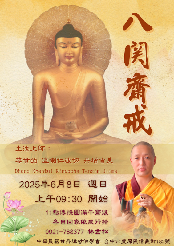 06月08日 週日 八關齋戒 達喇仁波切 格魯 法會 2025/06/08 報名連結 相關資訊 友善列印 上一篇:釋迦月聖地供燈計畫 下一篇:6/4 不丹 尊勝佛母千供消災延壽祈福法 精選法訊 薩迦普拉仁波切台北中心1-2月法訊 2026/01/31~2026/02/28 薩迦 法會 大乘聞思洲佛學會財神法會 2026/02/01 格魯 法會 02/01 三根本十號供超渡法會 2026/02/01 噶舉 法會 二月一日普巴金剛新年除障法會大樂佛學會 2026/02/01 寧瑪 法會 經續法林2月課程表 2026/02/01~2026/02/28 格魯 法會 臺北市祇園佛學會-2月份週日共修 2026/02/01~2026/02/15 噶舉 共修 台北賢遍佛學會 2 月共修表 2026/02/01~2026/02/28 寧瑪 共修 台中釋迦牟尼佛中心 2月課程表 2026/02/01~2026/02/28 格魯 法會 喇嘛網| Facebook 全球慈悲智慧數位佛學院 全球藏傳佛教最新弘法訊息﹝ Google全球第一資訊同步 ﹞