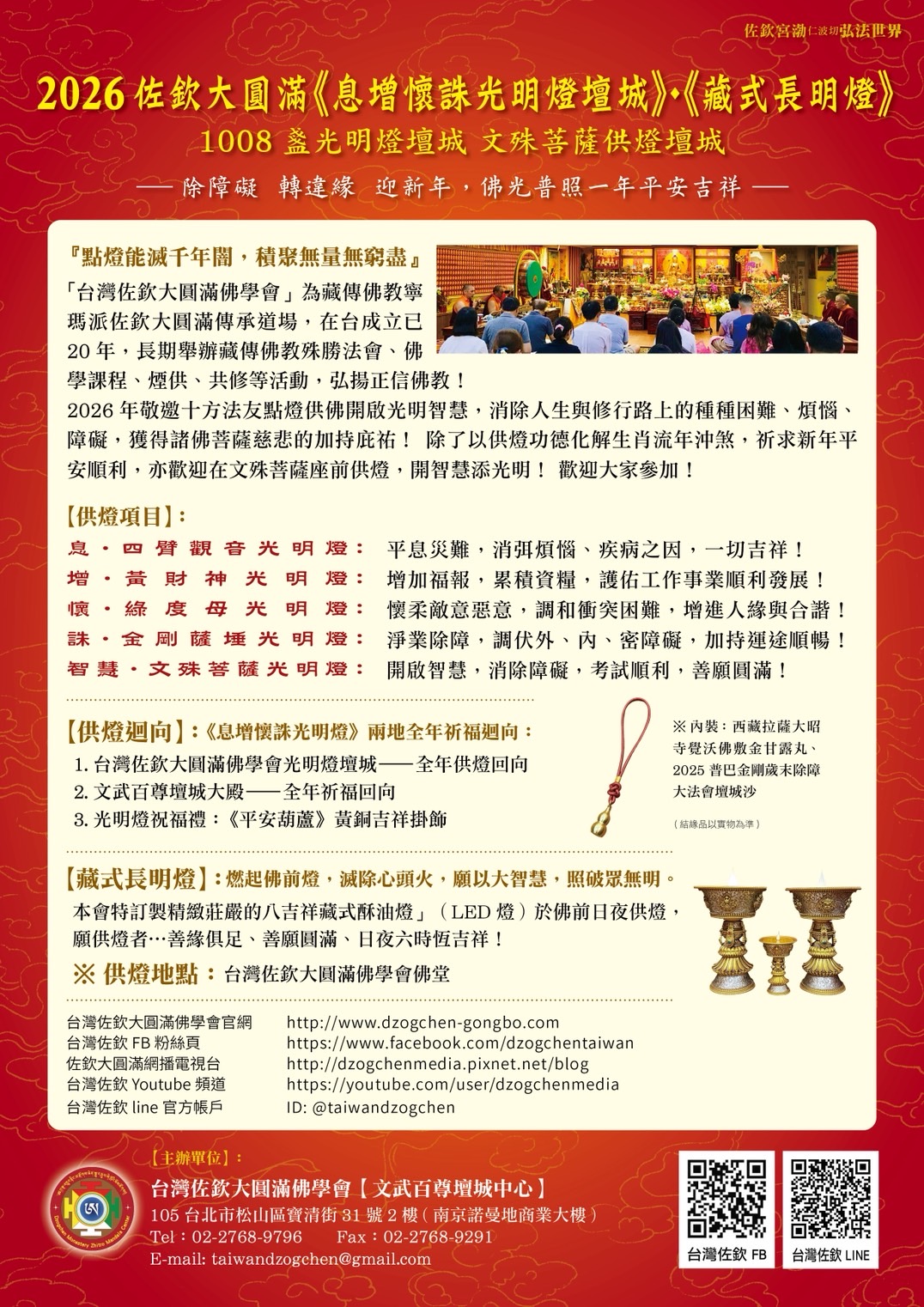2026佐欽大圓滿《息增懷誅光明燈壇城》‧《藏式長明燈》‧《文殊菩薩供燈壇城》