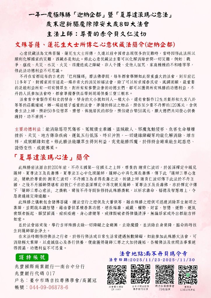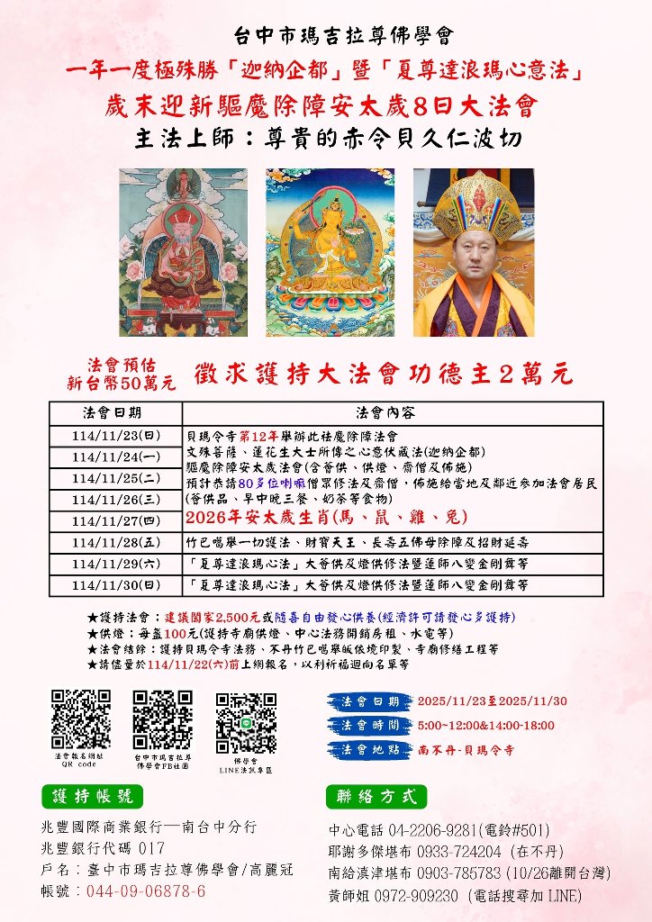 11/23-30歲末迎新一年一度安太歲法 主法上師:尊貴的 赤令貝久仁波切 噶舉 法會 2025/11/23~2025/11/30 我要參加 我要祈福 尊貴赤令貝久仁波切 【報名網址】https://www.beclass.com/rid=305018068e571fc8b28e 一年一度極殊勝「迦納企都」暨「夏尊達浪瑪心意法」 歲末迎新驅魔除障安太歲8日大法會 主法上師:尊貴的 赤令貝久仁波切 法會地點:南不丹貝瑪令寺 法會日期:114/11/23-30 【徵求護持大法會功德主 2 萬元】 備註:請儘量於11/22前上網報名,以利製作迴向名單。 歡迎隨喜發心護持, 共沾法喜,廣植福田,累積福智二資糧。 願諸佛菩薩加持,障礙悉除,福慧增長,事事吉祥。 ***************************** 兆豐國際商業銀行─南台中分行 兆豐銀行代碼 017 戶名:臺中市瑪吉拉尊佛學會/高麗冠 帳號:044-09-06878-6 ***************************** 中心電話 04-2206-9281(電鈴#501) 耶謝多傑堪布 0933-724204 (在不丹) 南給滇津堪布 0903-785783 (10/26離開台灣) 黃師姐 0972-909230 (電話搜尋加 LINE) 相關資訊 友善列印 下一篇:114/10/31 蓮師薈供 台中市瑪吉拉尊佛學會 偉大的不丹竹巴噶舉傳承 ~ 成就者之王 夏迦師利傳承 - 二位真正實修 , 都曾代表不丹國師的 LAM 仁波切 密勒日巴尊者夢授破瓦法 . 施身法 . 及各類甚深教法,口傳傳授 每月不定期舉辦灌頂 . 除障 . 薈供 . 超渡 . 火供..等法會 施身法共修 聯絡電話: :0972-909230 地址 : 台中市西區篤信街43巷20號5樓之1 精選法訊 熹嘉仁波切-觀音隨許灌頂&無量光佛隨許 2025/12/06~2025/12/07 格魯 灌頂 寧瑪經續光明佛學會12月法訊 2025/12/06~2025/12/29 寧瑪 法會 煙供法會&藥師佛火供 2025/12/06~2025/12/07 格魯 法會 佛光山萬緣水陸法會 2025/12/06~2025/12/13 顯教 法會 德謙讓卓-堪千竹清嘉措仁波切圓寂紀念音樂會 2025/12/07 噶舉 法會 更新上密院台北市佛學會114/12行事曆 2025/12/07~2025/12/31 格魯 法會 12/07 超渡- 三根本聯合救拔渡亡法 2025/12/07 噶舉 法會 空行心滴 耶喜措嘉無戲依一物息災火供 2025/12/07 寧瑪 火供 喇嘛網| Facebook 全球慈悲智慧數位佛學院 全球藏傳佛教最新弘法訊息﹝ Google全球第一資訊同步 ﹞