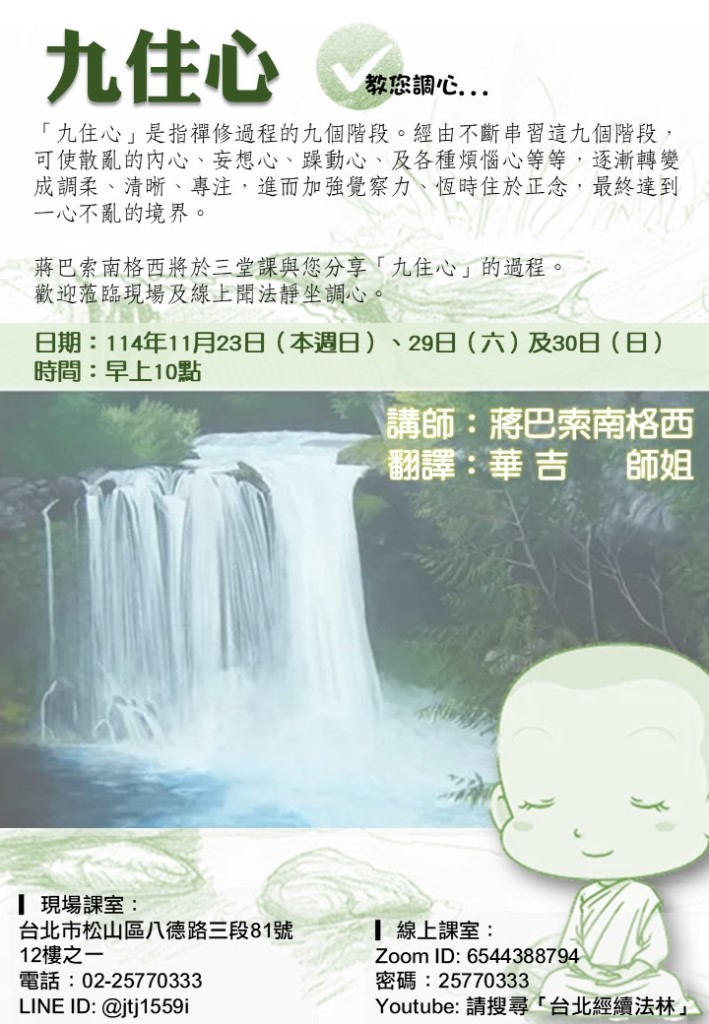 九住心 教您调心 主法上師:蔣巴索南格西 格魯 修行 2025/11/23~2025/11/30 蔣巴索南格西 九住心 教您调心 日期:114年11月23日(本週日)、29日(六)及30日(日) 時間:早上10點 講師:蔣巴索南格西 翻譯:華吉 師姐 現場課室:台北市松山區八德路三段81號12楼之一 電話:02-25770333 LINE ID: @jtj1559i 線上課室: Zoom ID: 6544388794 密碼:25770333 Youtube:請搜尋「台北經續法林」 友善列印 上一篇:2025年宗薩祈願法會 | 直播 下一篇:2025年 滇巴惹傑仁波切弘法行程 精選法訊 《中觀之鑰》開課 2025/11/19~2026/01/21 格魯 課程 經續法林2025年度寶瓶修法 2025/11/22 格魯 法會 熹嘉仁波切-佛陀初轉法輪教授&廣論口傳 2025/11/22~2025/11/30 格魯 教學 和南寺2025水陸大法會-祈願壇 2025/11/22~2025/11/30 顯教 法會 法鼓山大悲心水陸法會 2025/11/22~2025/11/29 顯教 法會 越老越有Fu:靈性關懷你我他 2025/11/22 利美 演講 11/23-30歲末迎新一年一度安太歲法 2025/11/23~2025/11/30 噶舉 法會 財寶主阿巴囉濟達無戲依一物祈福增益火供 2025/11/23 寧瑪 火供 喇嘛網| Facebook 全球慈悲智慧數位佛學院 全球藏傳佛教最新弘法訊息﹝ Google全球第一資訊同步 ﹞