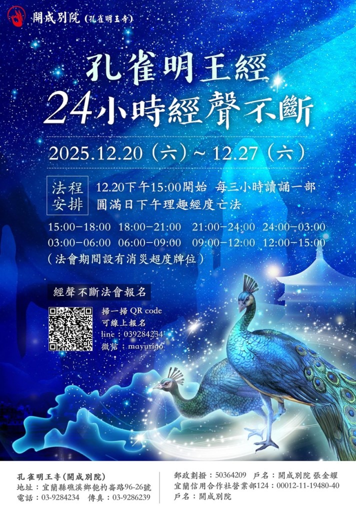 孔雀明王寺 24小時經聲不斷法會 顯教 法會 2025/12/20~2025/12/27 開成別院(孔雀明王寺) 「法會通啟」 2025年 孔雀明王寺 24小時經聲不斷法會 日期:2025. 12/20(六)下午三點至12/27(六)下午五點(七永日) 即日起開始受理報名: 線上表單已開啟: https://reurl.cc/7b32jb Line ID:039284234 傳真: 03-9286239 友善列印 上一篇:極密三面六臂瑪哈嘎拉暨欽寧體財神護法法會 下一篇:色拉味佛學院「僧伽醫療急難救助專款基金」 精選法訊 經續法林2025年度寶瓶修法 2025/11/22 格魯 法會 熹嘉仁波切-佛陀初轉法輪教授&廣論口傳 2025/11/22~2025/11/30 格魯 教學 和南寺2025水陸大法會-祈願壇 2025/11/22~2025/11/30 顯教 法會 法鼓山大悲心水陸法會 2025/11/22~2025/11/29 顯教 法會 越老越有Fu:靈性關懷你我他 2025/11/22 利美 演講 色拉味佛學院「僧伽醫療急難救助專款基金」 2025/11/22~2026/01/31 利美 公益 11/23-30歲末迎新一年一度安太歲法 2025/11/23~2025/11/30 噶舉 法會 財寶主阿巴囉濟達無戲依一物祈福增益火供 2025/11/23 寧瑪 火供 喇嘛網| Facebook 全球慈悲智慧數位佛學院 全球藏傳佛教最新弘法訊息﹝ Google全球第一資訊同步 ﹞