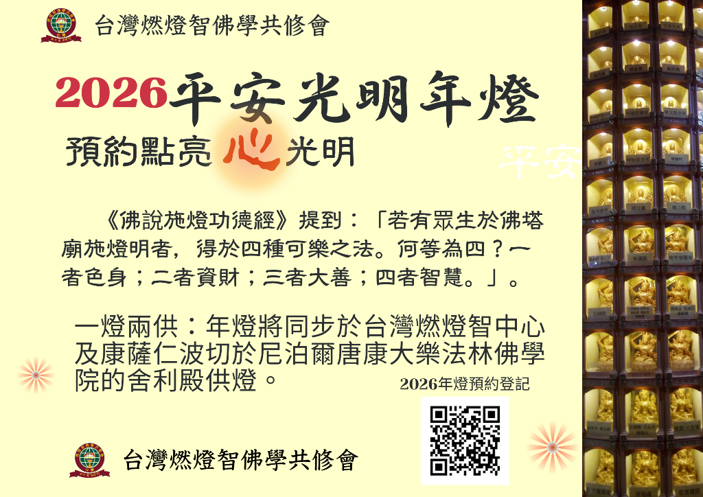 2026供燈祈福 格魯 公益 2025/11/27~2026/01/31 【2026供燈祈福】 2026年-尼泊爾唐康大樂法林暨臺灣燃燈智佛學共修會點燈祈福。 ★年燈為祈福者於兩處做供燈並迴向。 ★點燈登記後會先於中壢中心為你供燈直至明年底。 ★2026年初於大樂法林佛學院供燈一年。 報名連結: https://forms.gle/LAZSJrT6GRT6qt38A 匯款帳號: 銀行:第一銀行中原分行 ATM轉帳銀行代號:006 帳號:1391-717-20521-1 戶名:社團法人台灣燃燈智佛學共修會 聯絡方式:0909-737-955/0902-072-295 友善列印 上一篇:為2026年除障增福申請打卦做專項法事! 精選法訊 上密院台北市佛學會114/12行事曆 2025/11/25~2025/12/31 格魯 法會 僧伽長照-114年第六十一場梁皇寶懺法會 2025/11/26~2025/11/30 顯教 法會 為2026年除障增福申請打卦做專項法事! 2025/11/26~2026/02/27 薩迦 法會 南印~獅面空行母年度朵瑪回遮除障大法會 2025/11/27~2025/12/05 格魯 法會 2026供燈祈福 2025/11/27~2026/01/31 格魯 公益 札昂林巴八大嘿噜嘎灌頂法會 2025/11/28~2025/11/29 寧瑪 灌頂 2025 色拉昧 不共藥師佛大法會 2025/11/29 格魯 法會 蓮師海生金剛無戲依一物息災袪病延壽火供 2025/11/30 寧瑪 火供 喇嘛網| Facebook 全球慈悲智慧數位佛學院 全球藏傳佛教最新弘法訊息﹝ Google全球第一資訊同步 ﹞