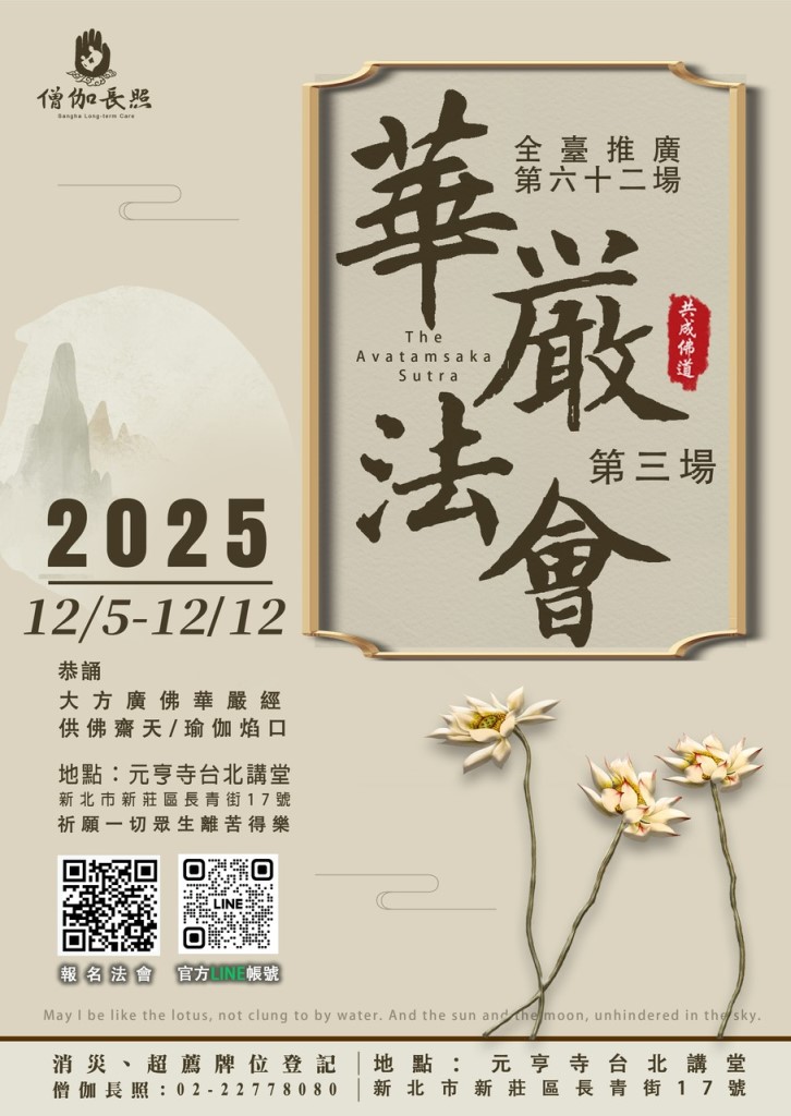 僧伽長照114年祈福大法會-華嚴經法會 顯教 法會 2025/12/05~2025/12/11 僧伽長照114年祈福大法會 全臺推廣第六十二場華嚴第3場【新北場】 法會時間 1.《華嚴經》:114年12月5日~11日 2. 供佛齋天/瑜伽焰口:114年12月12日 法會地點 新北市新莊區長青街17號(元亨寺台北講堂) 活動洽詢:僧伽長照 02-22778080 法會牌位登記: https://www.beclass.com/rid=30501fa692b8d1dc991d 法師報名連結: https://www.beclass.com/rid=30501fa692b8ebe0a773 友善列印 上一篇:《佛學要義》初階課程 下一篇:佛光山萬緣水陸法會 精選法訊 2025年 滇巴惹傑仁波切弘法行程 2025/11/30~2026/01/04 噶舉 法會 11/30吉祥天母暨護法酬懺薈供除障法會 2025/11/30~2025/12/05 格魯 法會 印度菩提伽耶薩迦大慈三乘法輪寺冬季傳法 2025/12/01~2025/12/24 薩迦 法會 臺灣色拉傑佛學會12月法訊 2025/12/01~2025/12/31 格魯 法會 台灣聞思寶藏佛學會12月法訊 2025/12/01~2025/12/31 格魯 法會 經續法林12月課程表 2025/12/01~2025/12/31 格魯 法會 台北賢遍佛學會 12 月共修表 2025/12/01~2025/12/31 寧瑪 共修 2025年12月 德威仁波切 主法法會 2025/12/02~2026/01/01 寧瑪 法會 喇嘛網| Facebook 全球慈悲智慧數位佛學院 全球藏傳佛教最新弘法訊息﹝ Google全球第一資訊同步 ﹞