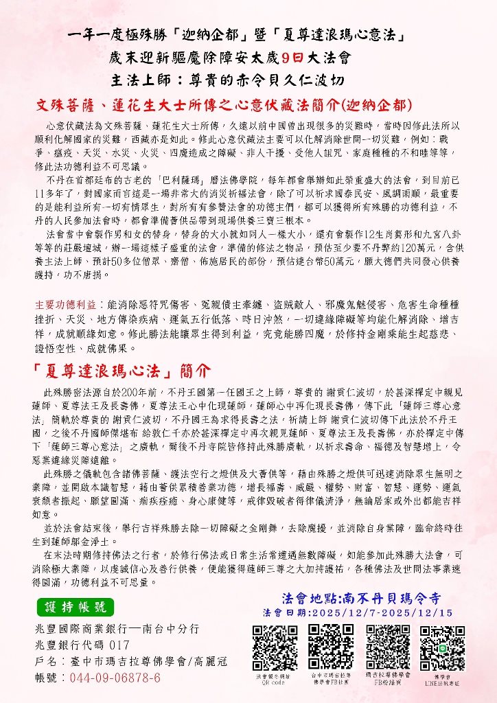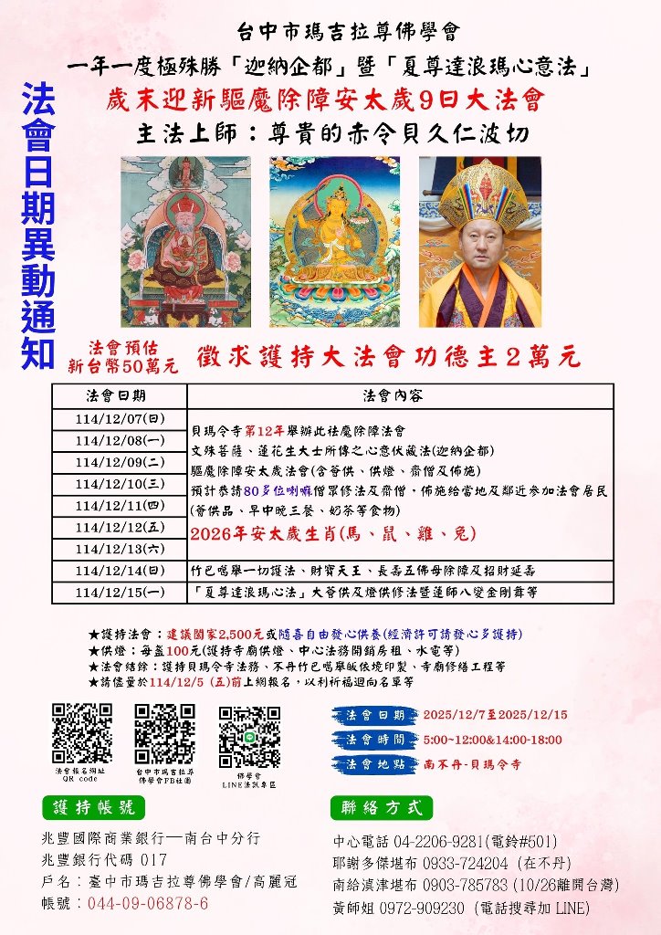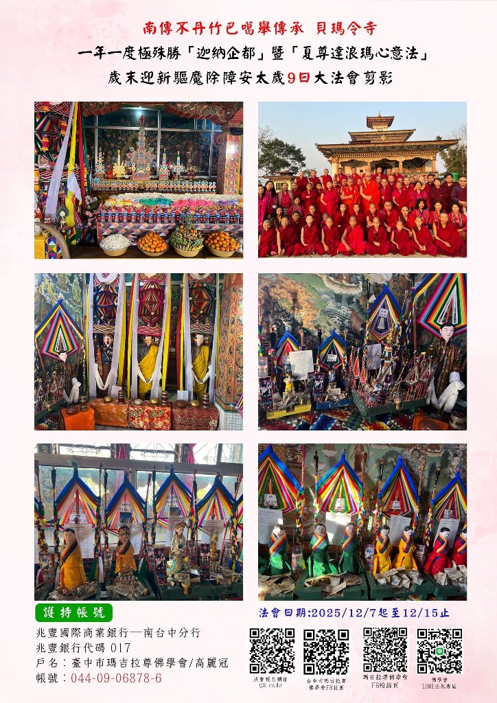 12/7-15 不丹極殊勝9日安太歲除障 主法上師:尊貴的 赤令貝久仁波切 噶舉 法會 2025/12/11~2025/12/16 我要參加 我要祈福 尊貴赤令貝久仁波切 【徵求護持大法會功德主 2 萬元】 【報名網址】https://www.beclass.com/rid=305018068e571fc8b28e 一年一度極殊勝 「迦納企都」暨「夏尊達浪瑪心意法」 歲末迎新驅魔除障安太歲9日大法會 主法上師:尊貴的 赤令貝久仁波切 法會地點:南不丹貝瑪令寺 ※原訂法會日期:114/11/23-30 (8日) ※確定法會日期:114/12/7-12/15 (9日) 備註:請儘量於12/5 (五)前上網報名,以利製作迴向名單。 歡迎隨喜發心護持, 共沾法喜,廣植福田,累積福智二資糧。 願諸佛菩薩加持,障礙悉除,福慧增長,事事吉祥。 ***************************** 兆豐國際商業銀行─南台中分行 兆豐銀行代碼 017 戶名:臺中市瑪吉拉尊佛學會/高麗冠 帳號:044-09-06878-6 ***************************** 中心電話 04-2206-9281(電鈴#501) 耶謝多傑堪布 0933-724204 (在不丹) 南給滇津堪布 0903-785783 (10/26離開台灣) 黃師姐 0972-909230 (電話搜尋加 LINE) 友善列印 上一篇:二臂vs六臂瑪哈嘎拉除障招財薈供大法會 下一篇:《安樂道論》教授&白度母長壽灌頂 台中市瑪吉拉尊佛學會 偉大的不丹竹巴噶舉傳承 ~ 成就者之王 夏迦師利傳承 - 二位真正實修 , 都曾代表不丹國師的 LAM 仁波切 密勒日巴尊者夢授破瓦法 . 施身法 . 及各類甚深教法,口傳傳授 每月不定期舉辦灌頂 . 除障 . 薈供 . 超渡 . 火供..等法會 施身法共修 聯絡電話: :0972-909230 地址 : 台中市西區篤信街43巷20號5樓之1 精選法訊 「薄伽梵獨勇怖畏金剛成就法」專修法會 2026/01/17~2026/01/18 格魯 法會 馬頭明王護法酬懺曁洗塵除障法會 2026/01/17 格魯 法會 『大白傘蓋佛母』迴遮除障驅邪同修法會 2026/01/17 寧瑪 法會 歲末回遮除障法會法訊 2026/01/17~2026/01/24 寧瑪 法會 第八屆藥師佛文化節 2026/01/17~2026/01/18 顯教 法會 黃財神共修+瑪哈嘎拉三尊祈福除障法會 2026/01/17 噶舉 法會 歲末般若心經除障大法會 2026/01/18 寧瑪 法會 普巴除障蓮師長壽佛羅漢財神開運+喬遷功德 2026/01/18~2026/02/17 寧瑪 法會 喇嘛網| Facebook 全球慈悲智慧數位佛學院 全球藏傳佛教最新弘法訊息﹝ Google全球第一資訊同步 ﹞