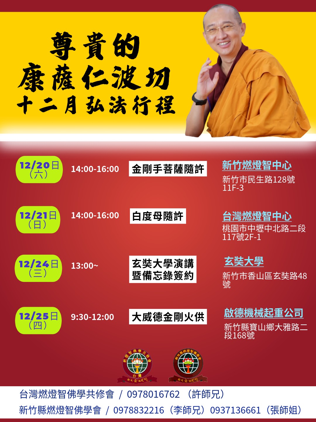 康薩仁波切2025年12月弘法行程 主法上師:尊貴 康薩仁波切 格魯 灌頂 2025/12/20~2025/12/25 尊貴康薩仁波切 康薩仁波切2025年12月弘法行程 友善列印 上一篇:《安樂道論》教授&白度母長壽灌頂 下一篇:洛桑德勒堪蘇仁波切弘法行程 精選法訊 印度菩提伽耶薩迦大慈三乘法輪寺冬季傳法 2025/12/01~2025/12/24 薩迦 法會 臺灣色拉傑佛學會12月法訊 2025/12/01~2025/12/31 格魯 法會 台灣聞思寶藏佛學會12月法訊 2025/12/01~2025/12/31 格魯 法會 經續法林12月課程表 2025/12/01~2025/12/31 格魯 法會 台北賢遍佛學會 12 月共修表 2025/12/01~2025/12/31 寧瑪 共修 12/7-15 不丹極殊勝9日安太歲除障 2025/12/01~2025/12/16 噶舉 法會 2025年12月 德威仁波切 主法法會 2025/12/02~2026/01/01 寧瑪 法會 伏魔洲伏藏『施身法之紅施』教授5 2025/12/02 寧瑪 教學 喇嘛網| Facebook 全球慈悲智慧數位佛學院 全球藏傳佛教最新弘法訊息﹝ Google全球第一資訊同步 ﹞