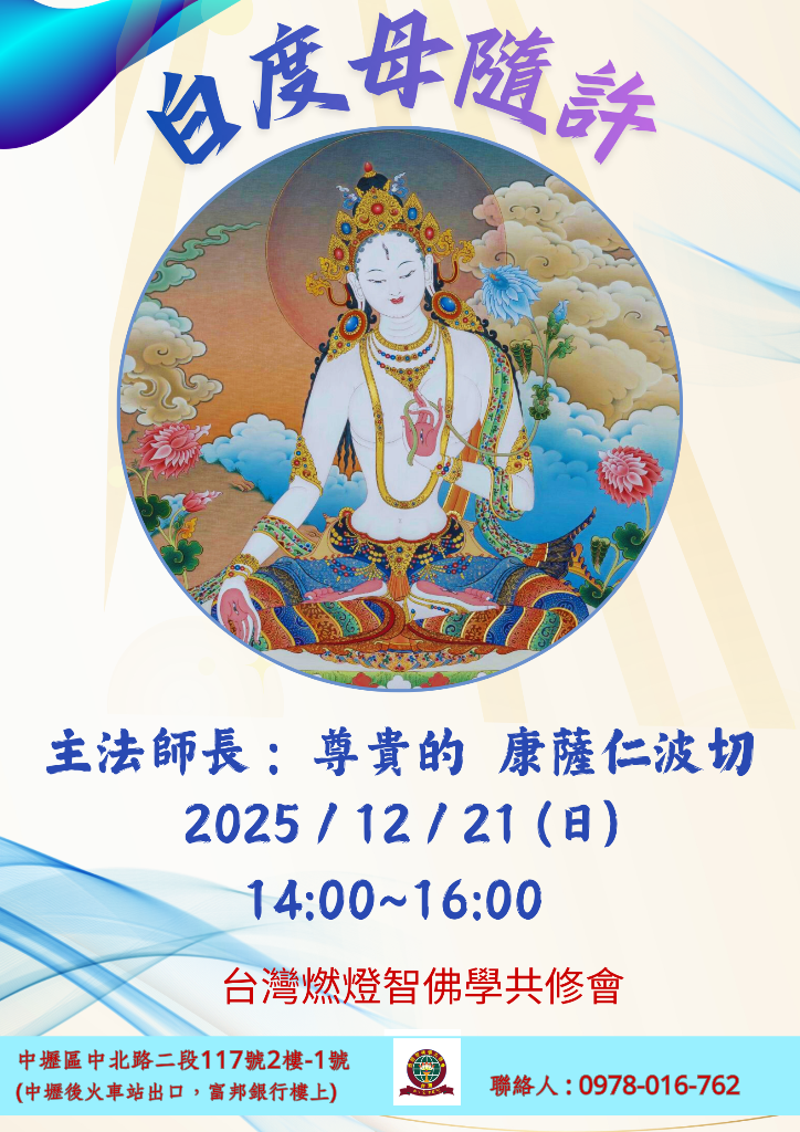 聖母白度母隨許 主法上師:尊貴的康薩仁波切 格魯 灌頂 2025/12/21 尊貴康薩仁波切 聖母白度母隨許 【主法師長】: 尊貴的康薩仁波切 【日期】: 2025年12月21號 (星期日) 【時間】: 14:00~16:00 【地點】: 台灣燃燈智佛學共修會 【地址】: 桃園市中壢區中北路二段117號2樓之1(中壢後火車站出口,富邦銀行樓上) 【電話】: 0978-016-762 (許師兄) 報名連結: https://forms.gle/muDWVRT5Gyk2DTTq8 友善列印 上一篇:2026尼泊爾藍毗尼聖園大塔院佛前供燈 下一篇:燃燈節宗大師成道紀念日上師薈供法會 精選法訊 《佛學要義》初階課程 2025/12/05~2026/02/27 格魯 課程 僧伽長照114年祈福大法會-華嚴經法會 2025/12/05~2025/12/11 顯教 法會 台灣佛法顯密洲佛學會2025.12月法訊 2025/12/05~2025/12/31 寧瑪 灌頂 2026尼泊爾藍毗尼聖園大塔院佛前供燈 2025/12/05~2025/12/20 噶舉 其它 熹嘉仁波切台中傳法法會 2025/12/06 格魯 法會 科技與心靈的三重奏:AI、心理學與佛法的交會 2025/12/06 利美 研討 熹嘉仁波切-觀音隨許灌頂&無量光佛隨許 2025/12/06~2025/12/07 格魯 灌頂 寧瑪經續光明佛學會12月法訊 2025/12/06~2025/12/29 寧瑪 法會 喇嘛網| Facebook 全球慈悲智慧數位佛學院 全球藏傳佛教最新弘法訊息﹝ Google全球第一資訊同步 ﹞
