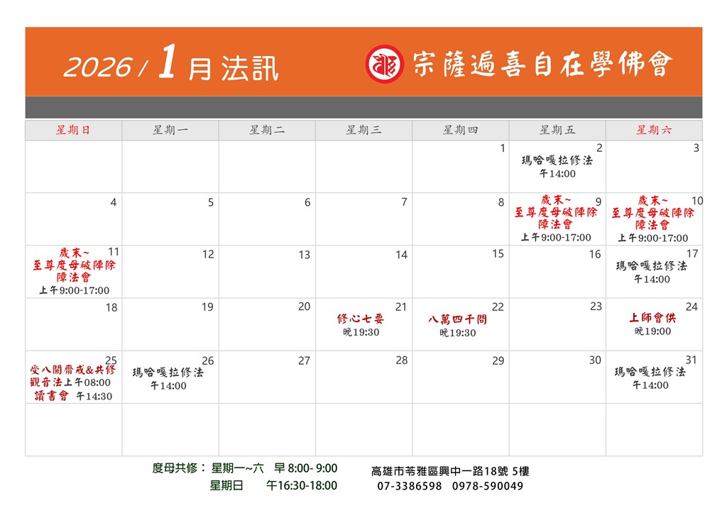宗薩遍喜自在學佛會2026年1月法訊 主法上師:堪布徹仁 薩迦 法會 2025/12/02~2025/12/31 堪布徹仁 宗薩遍喜自在學佛會2026年1月法訊 高雄市苓雅區興中一路18號5樓 電話:07-3386598、0978-590049 友善列印 上一篇:2026一月及二月度母共修 下一篇:臺灣色拉傑佛學會2026年1月法訊 精選法訊 二臂vs六臂瑪哈嘎拉除障招財薈供大法會 2025/12/30~2026/01/07 噶舉 法會 2/30-1/7 歲末除障法會再窺 2025/12/30~2026/01/07 噶舉 法會 成就自在貝諾法王揚希仁波切生日慶祝法會 2025/12/31 寧瑪 法會 貝諾法王轉世貝諾揚希仁波切吉祥慶生法會 2025/12/31 寧瑪 法會 2026佐欽《慈悲利眾法會、護持道場》 2026/01/01~2026/12/31 寧瑪 法會 115年新年點光明燈祈福法會 2026/01/01 噶舉 法會 臺灣格魯總會第一屆佛法論壇 2026/01/01 格魯 演講 2026年1月 德威仁波切 主法法會 2026/01/01~2026/01/25 寧瑪 法會 喇嘛網| Facebook 全球慈悲智慧數位佛學院 全球藏傳佛教最新弘法訊息﹝ Google全球第一資訊同步 ﹞